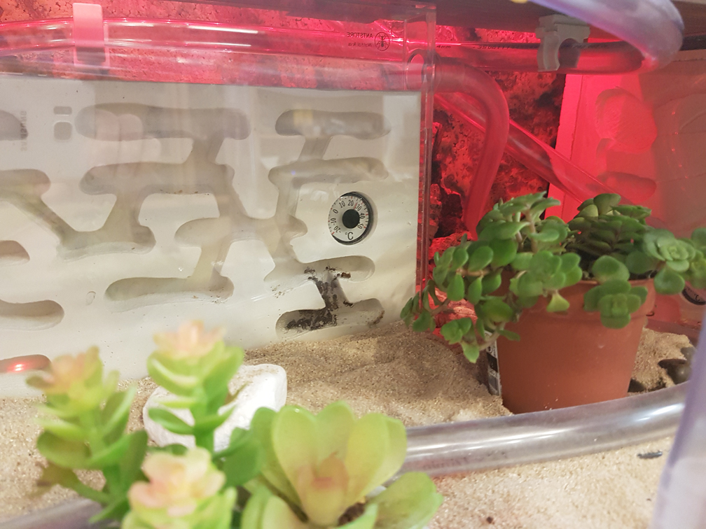 Diese Kolonie ist jetzt seit 24.01.17 bei mir und kam mit ca. 40 Arbeiterinnen, davon 4 Majore. Das Nest ansich befindet sich "unterirdisch" eine Ebene tiefer und wird mittels Heizkabel extra beheizt. So kann ich unterschiedliche Temperaturen erreichen. Damit beheize ich auch andere Arten. Mittels Heizkabel klappt das ganz gut, da kann man ja durch mehr Windungen oder weniger besser die Wärme der einzelnen Zonen und Arten regulieren. Das Nest ist ein Gipsnest in einer Glasfarm vom Berliner Händler und eines in Eigenbau, rechts daneben. Temperatur dort seit langer Zeit am Tage bei 27-28 Grad eingependelt, nachts durch längere "Heizpause" bei 25-26 Grad, nie drunter. Beim anderen Nest sind die unteren Kammern um die 28 Grad, die oberen kühler. Die Ameisen können dann selber mal gucken wo es kuschliger ist oder nicht. Die Schaltuhr springt das letzte Mal um 22:45 bis 23:30 Uhr an und dann erst wieder 7 Uhr morgens.