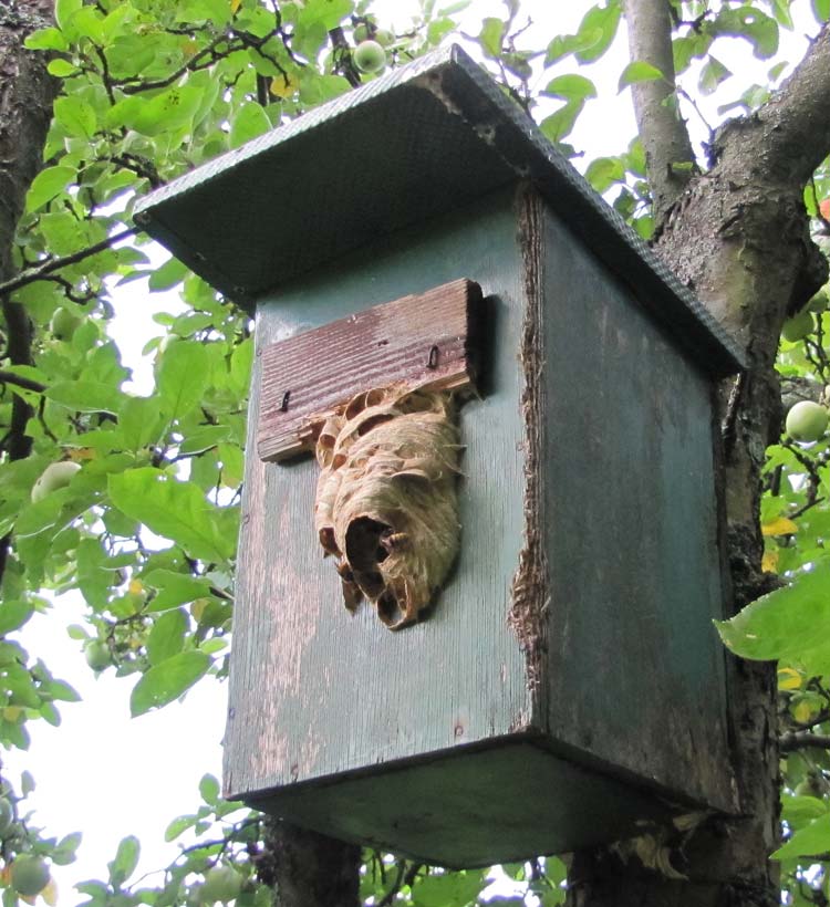Das erste zeigt die Gesamtsituation (samt Ăpfeln!); vor allem der Nestteil unter dem Nistkasten hat zugenommen.
