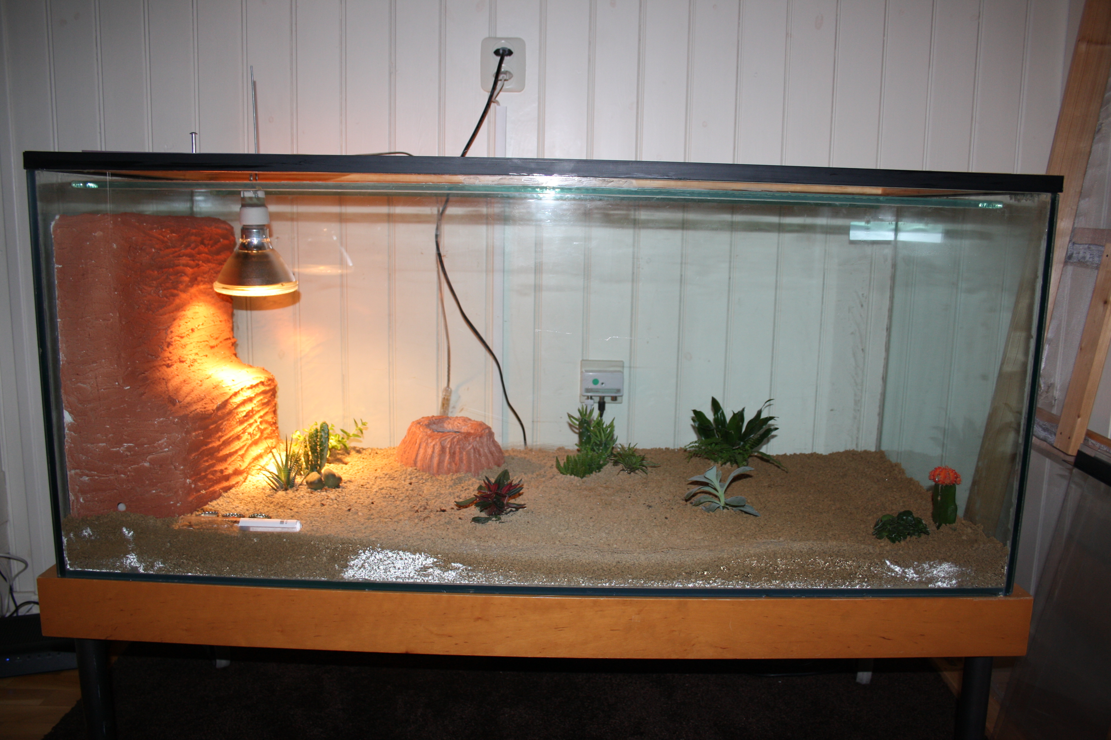 Einzige Wärmequelle bisher ist eine Lampe angebracht am Deckel des Beckens - Temperaturgefälle 23 bis 26°C.