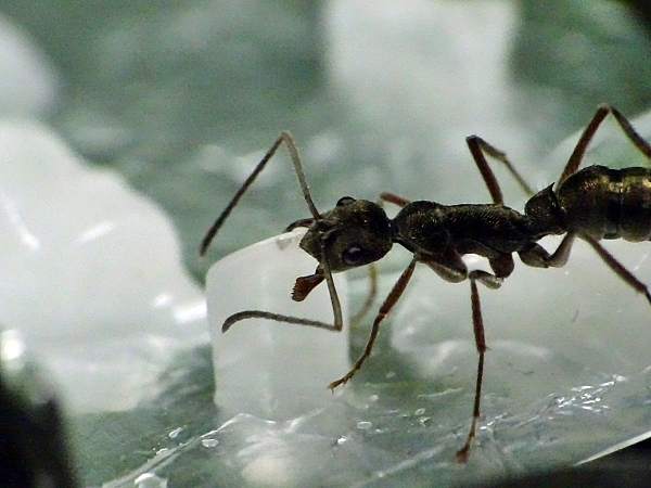 . Es ist schon irgendwie erstaunlich, dass die Ameisen es schaffen, Stücke aus dem doch recht weichen Jelly zu schneiden und diese dann auch noch transportieren können, ohne dass das Stück zerläuft. Vielleicht sollte ich mal schauen, ob meine Odontomachus auch auf Jelly abfahren (allerdings müsste ich dann vorher welchen bestellen).