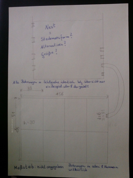 Im späteren Verlauf soll es so sein, dass es pro Schlauch/Kammer nur eine Futterart gibt, also entweder Kohlenhydrate oder Proteine. Der überirdische Ausgang wird dann nur noch zu einem Wassertank (Reagenzglas) führen. Die Gründungskammer kann ich dann hoffentlich abkoppeln. Dieses Loch wird verschlossen und dient höchstens später dazu ein weiteres Nest anzuschließen, wenn dieses zu klein wird.