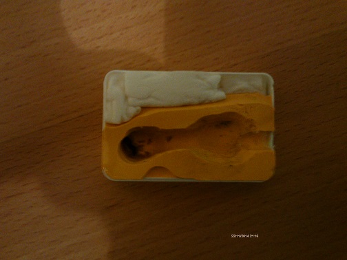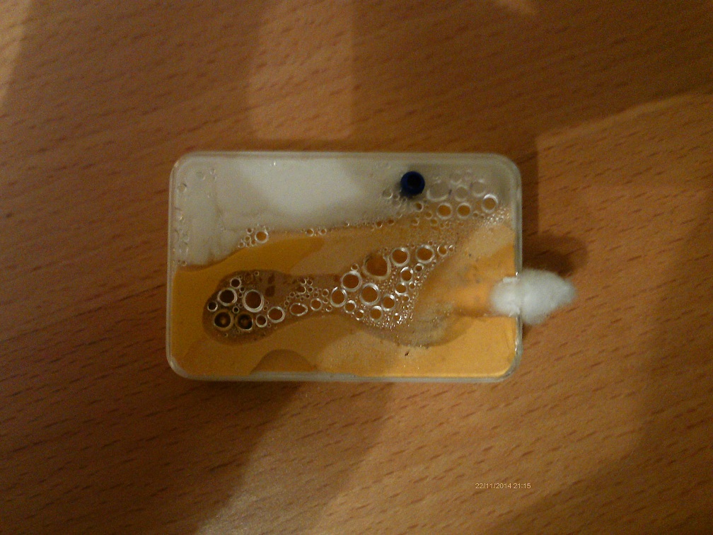 Zunächst entstand etwas Kondenswasser. Es waren keine großen Tropfen, der Gips, der seine Endhärte beim Einsetzen der Gyne noch nicht erreicht hatte, gab sein Kristallwasser frei. Dieses entfernte ich mit einem Wattestäbchen.
