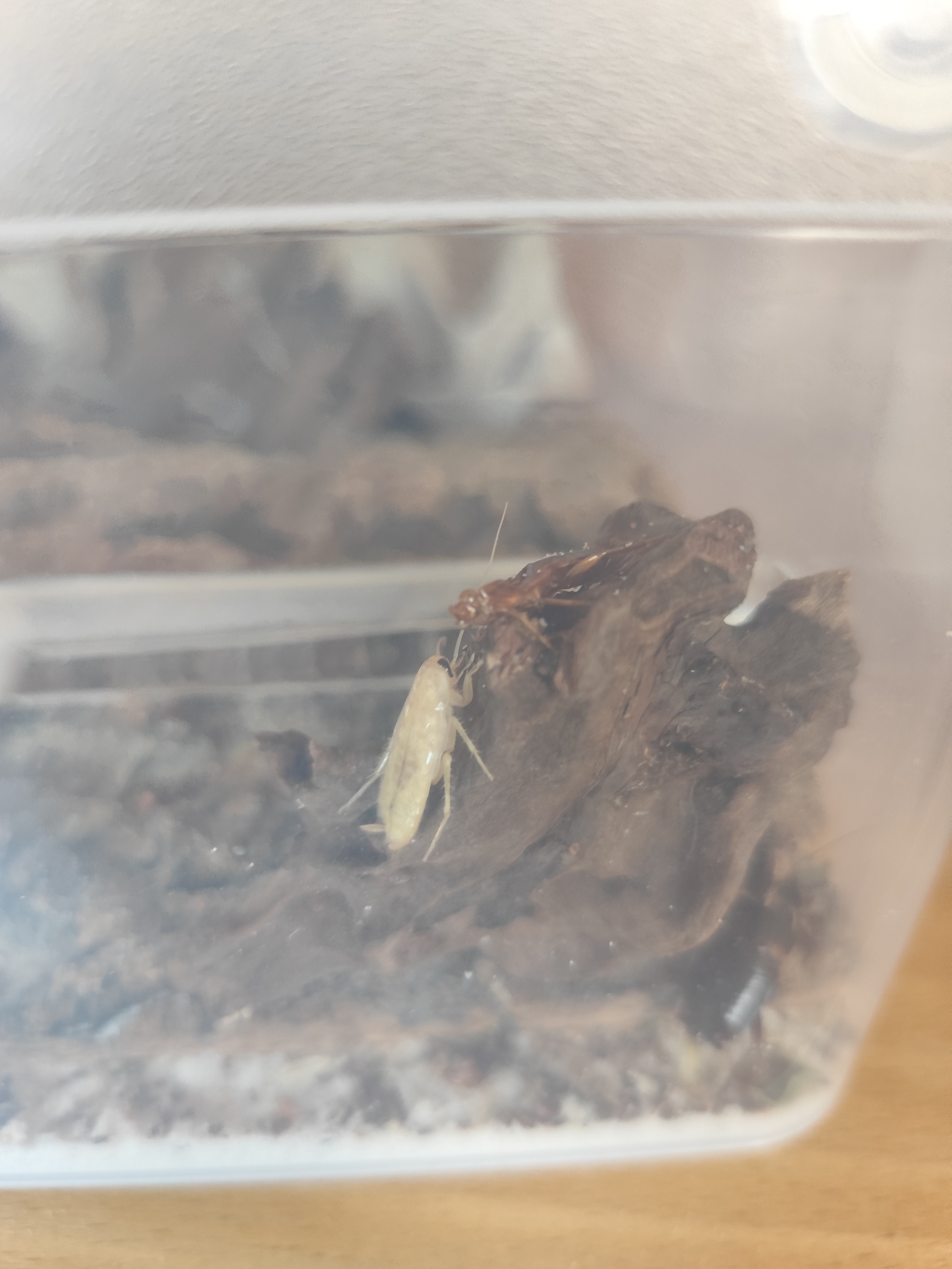 Zwar keine Ameisen, ich fand es dennoch recht interessant: Eine frisch gehäutete Jungschabe neben ihrer alten "Hülle."