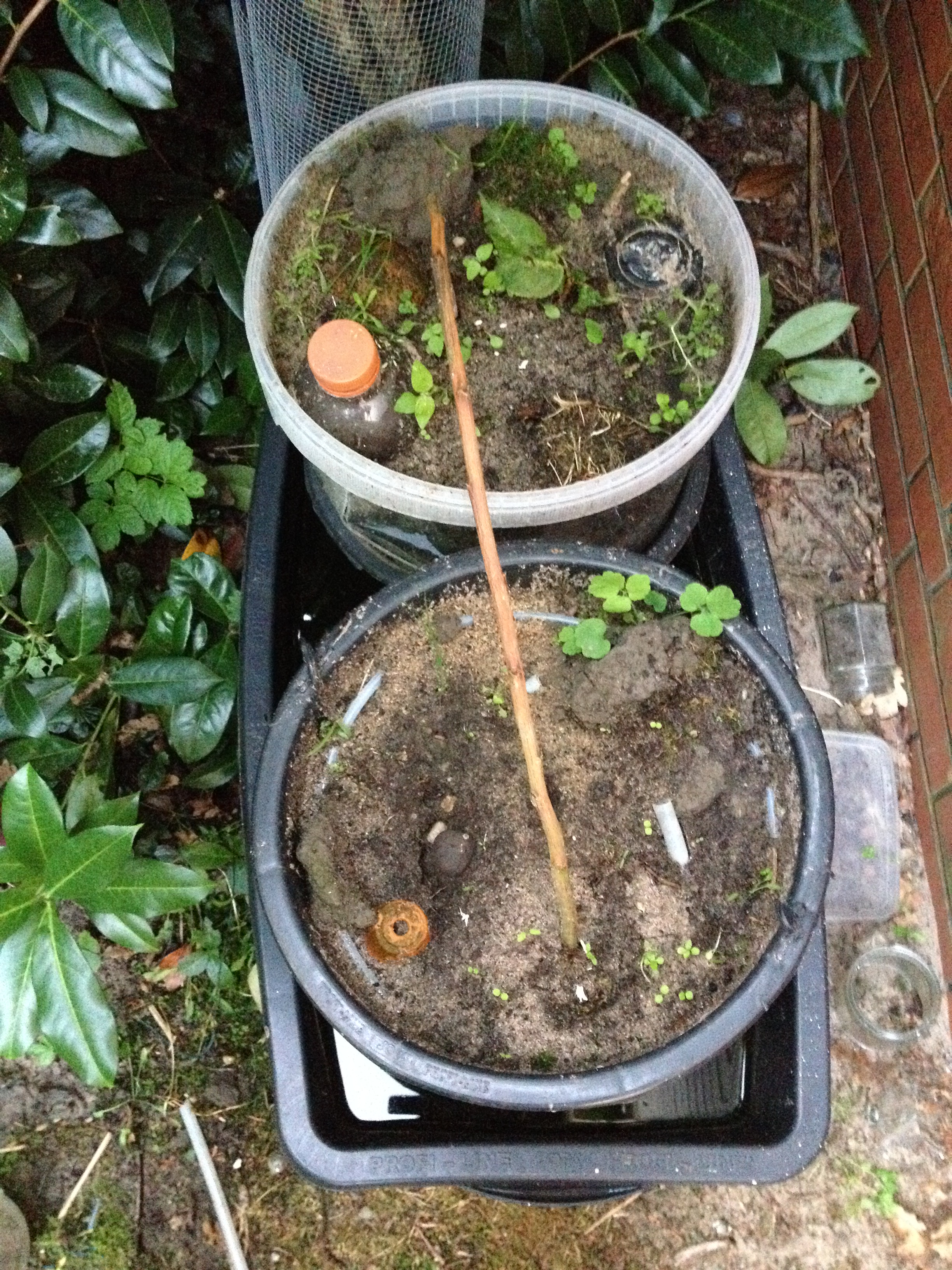 Ich habe ganz einfach einen Maurerkübel mit Wasser gefüllt und darin mittig ein paar Pflastersteine gelegt. Auf diesen Steinen stehen nebeneinander zwei Eimer. Diese eimer haben löcher im Boden, dass dort von unten Wasser rein und raus kann. Sie stehen aber nur ganz leicht im Wasser, sind aber eben von Wasser umgeben.
