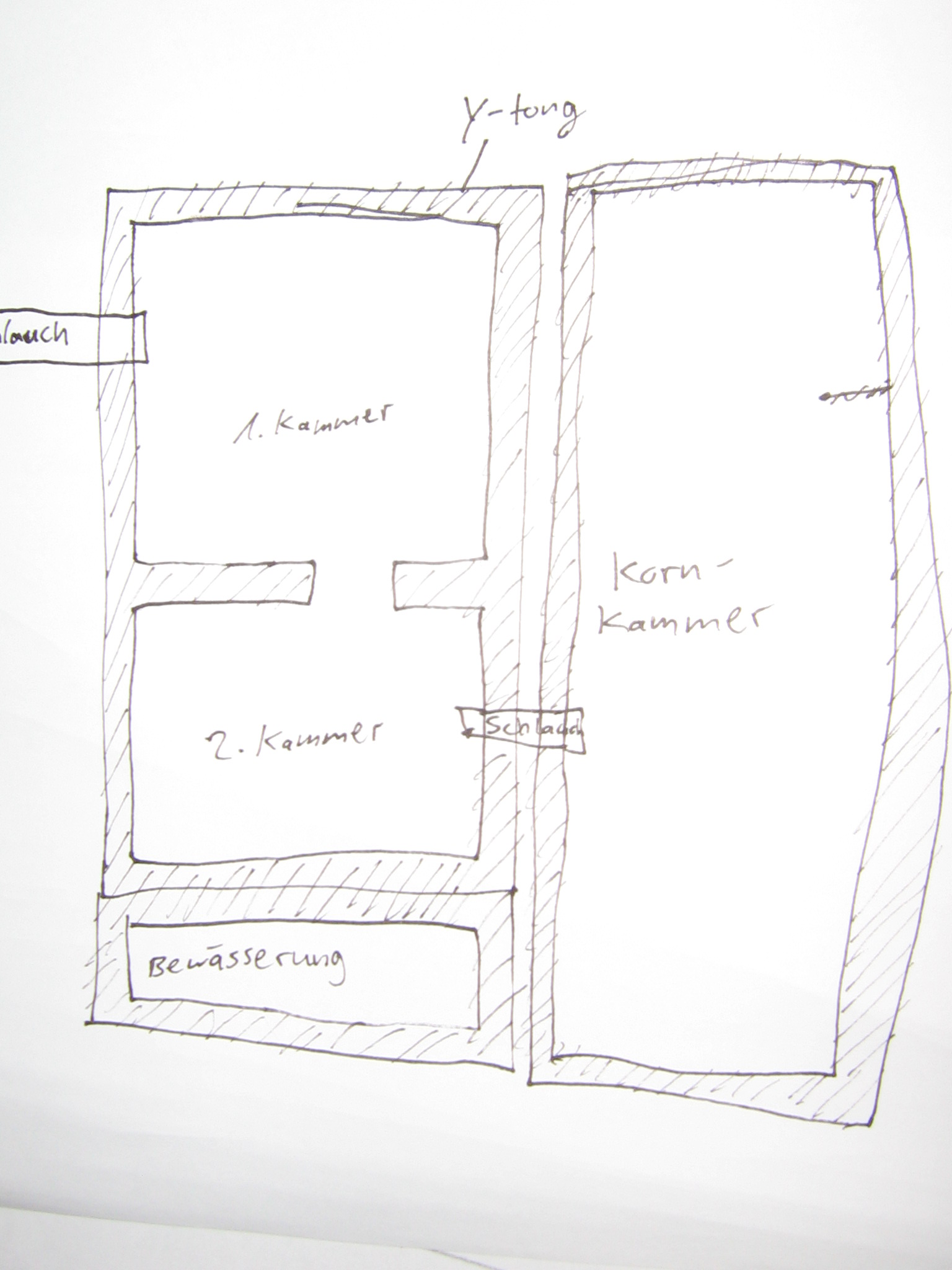 Ich will die Kleinen ja auch in ein Nest einziehen lassen. DafĂŒr hab ich ein Ytong-nest gewĂ€hlt, da ich dies am sinnvollsten finde. Es soll zwei Brutkammern haben und eine seperate Kornkammer, die mit einem kurzen StĂŒck Schlauch am Brutbereich angeschlossen ist. Ich habe eine Skizze gemacht. (Ich weiß, ich bin nicht Picasso!:furchtbartraurig:)