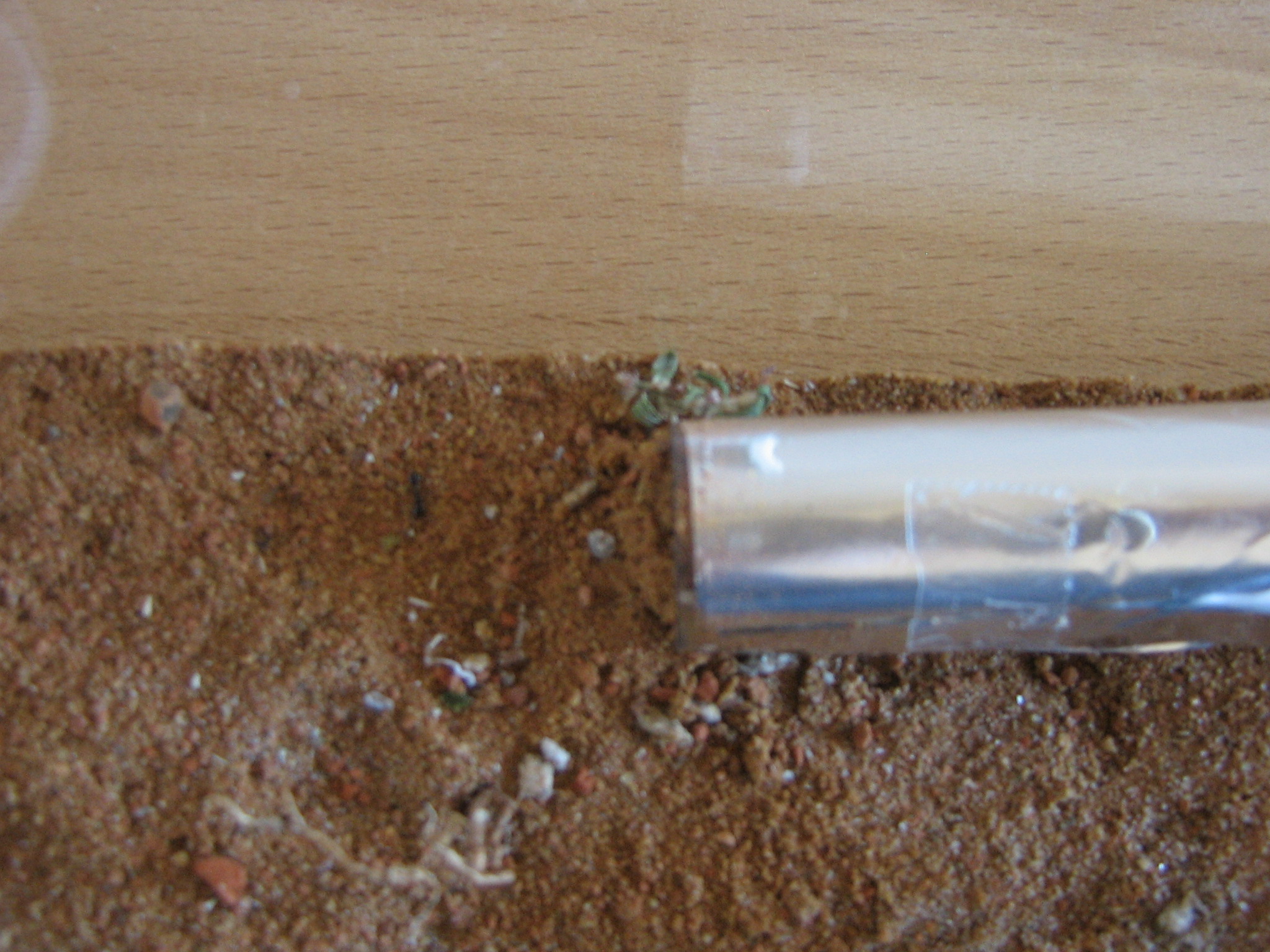 Nachdem ich das getan hatte, legte ich vorsichtig das Rg an einen Platz im Formicarium. Sogleich erkundeten drei Arbeiterinn die nÀhere Umgebung! Es waren zwei Kleinere (PygmÀen) und einer Minor arbeiterin.
