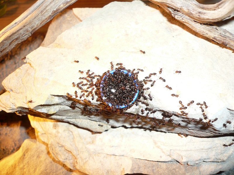 Schnell wurden sie aktiv, badeten in der künstlichen Sonne und schmissen die Toten aus dem Nest, interessanterweise nur in einem geringen Radius vom Nest entfernt und nicht auf ihren Müll am andren Ende des Formis.