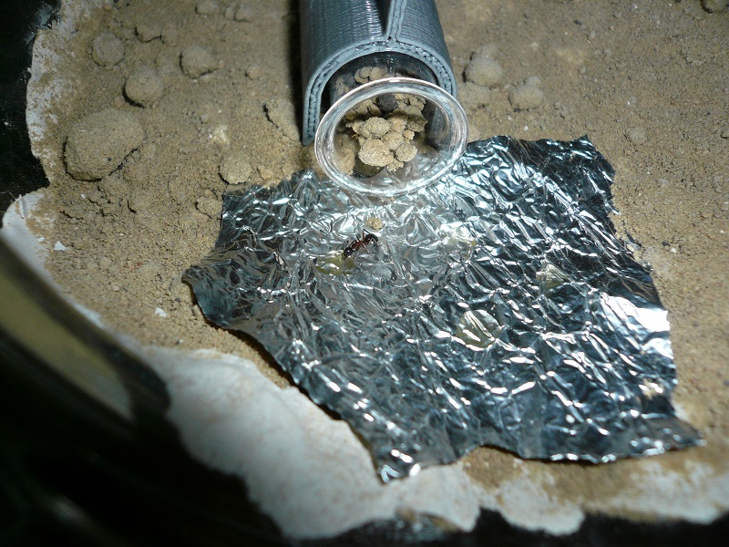 Der Hunger ist unglaublich und die Ausbruchsversuche dementsprechend hoch und leider auch erfolgreich. In ihrem Hunger hat sie der Rahmen mit dem Paraffinöl, den ich gebastelt und angebracht hatte, wenig aufgehalten und immer, wenn ich eines der Löcher, die sie im Silikon beim „Ausgangspfusch“ entdeckt hatten, gefunden, zugeklebt und die ausgebrochenen Ameisen ins Formi zurückgeschmissen hatte, fanden sie ne Stunde später ein neues Loch. Das zog sich einige nervenaufreibende Tage hin, aber jetzt haben sie Dank eines –wie ich dachte- überdimensioniert großen Klumpen Katzenfutters, den sie innerhalb von 24 Stunden ins Nest schleppten, vorerst weniger Hunger ^^