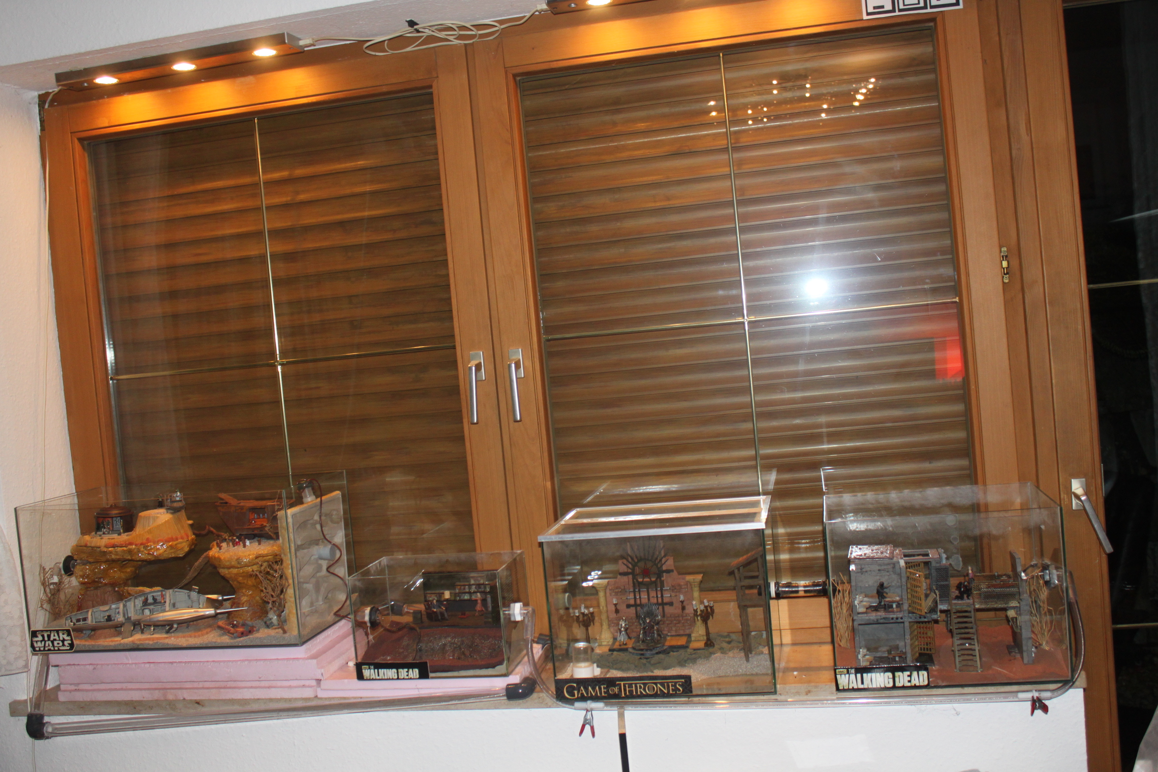 Hierfür habe ich - Walking Dead, Game of Thrones und Star Wars als Thema genutzt und entsprechende Formicarien gestaltet. Die Foirmicarien sind mit Röhrensystem verbunden insgesamt haben die Tiere somit