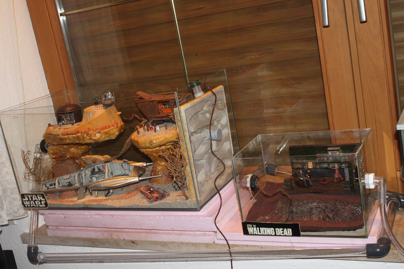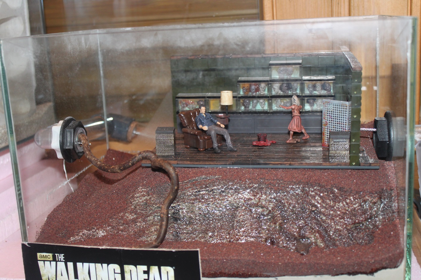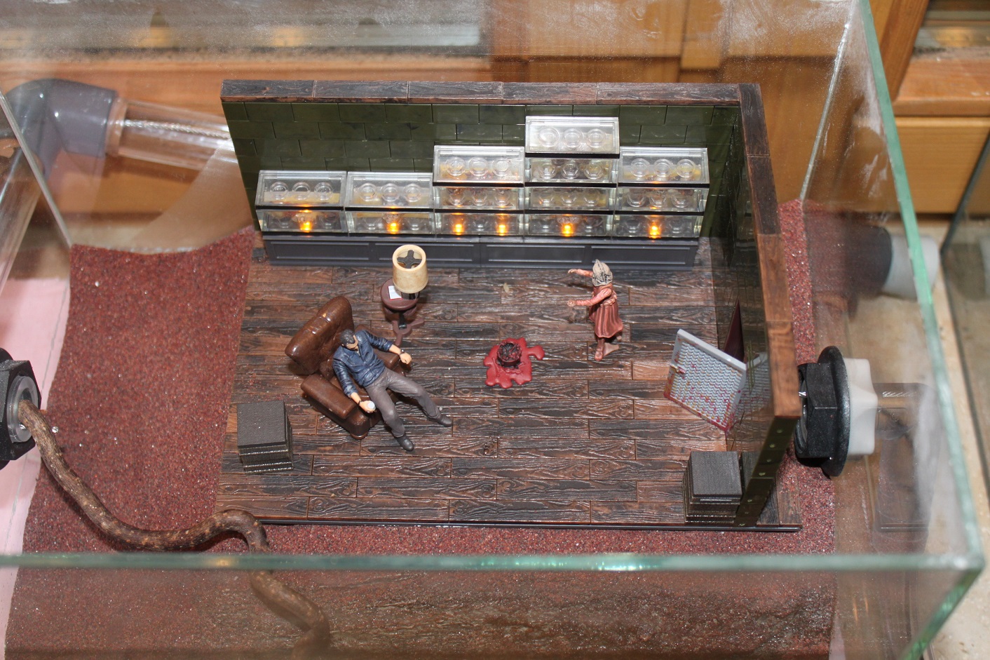 Dieses Terrarium ist mit einer ca 1,50m langen Rohr/Schlauch-Verbindung zum zweiten Walking Dead Arena (30x20x20) verbunden. Hier erwartet die Tiere der Raum des Governor's.