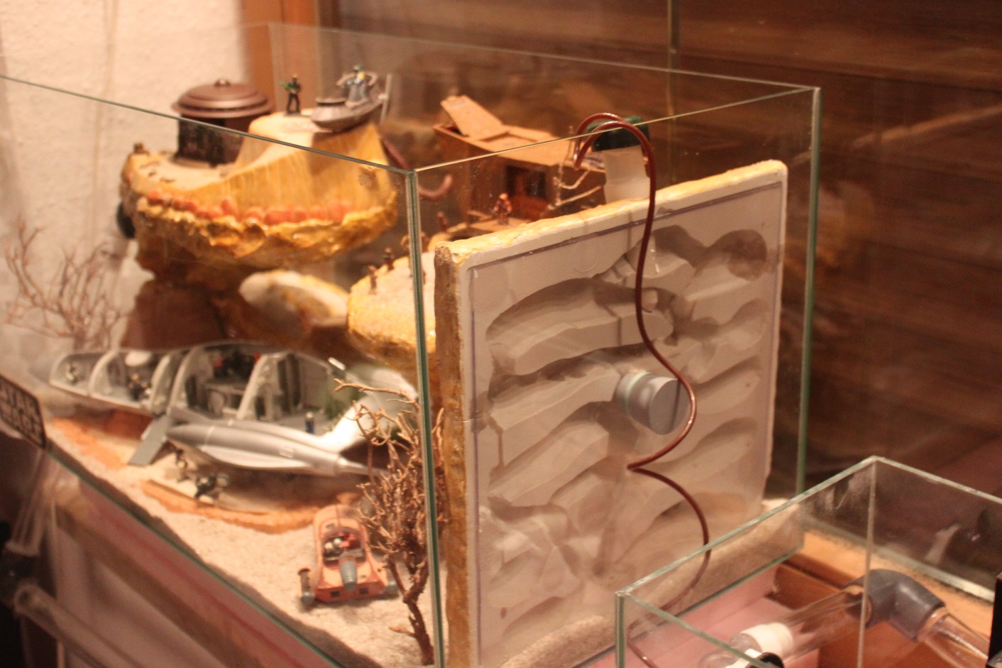 Der Raum ist auf einem Gipssockel, den ich mit Harz und Sand überarbeitet habe, erhöht worden. Der Sinn darin ist, dass die Tiere direkt durch den Raum laufen und hoffentlich auch die Tür benutzen. Das Formikarium wiederum ist mit einer sicherlich 2,10m Rohrverbindung mit dem Star-Wars Terrarium verbunden.