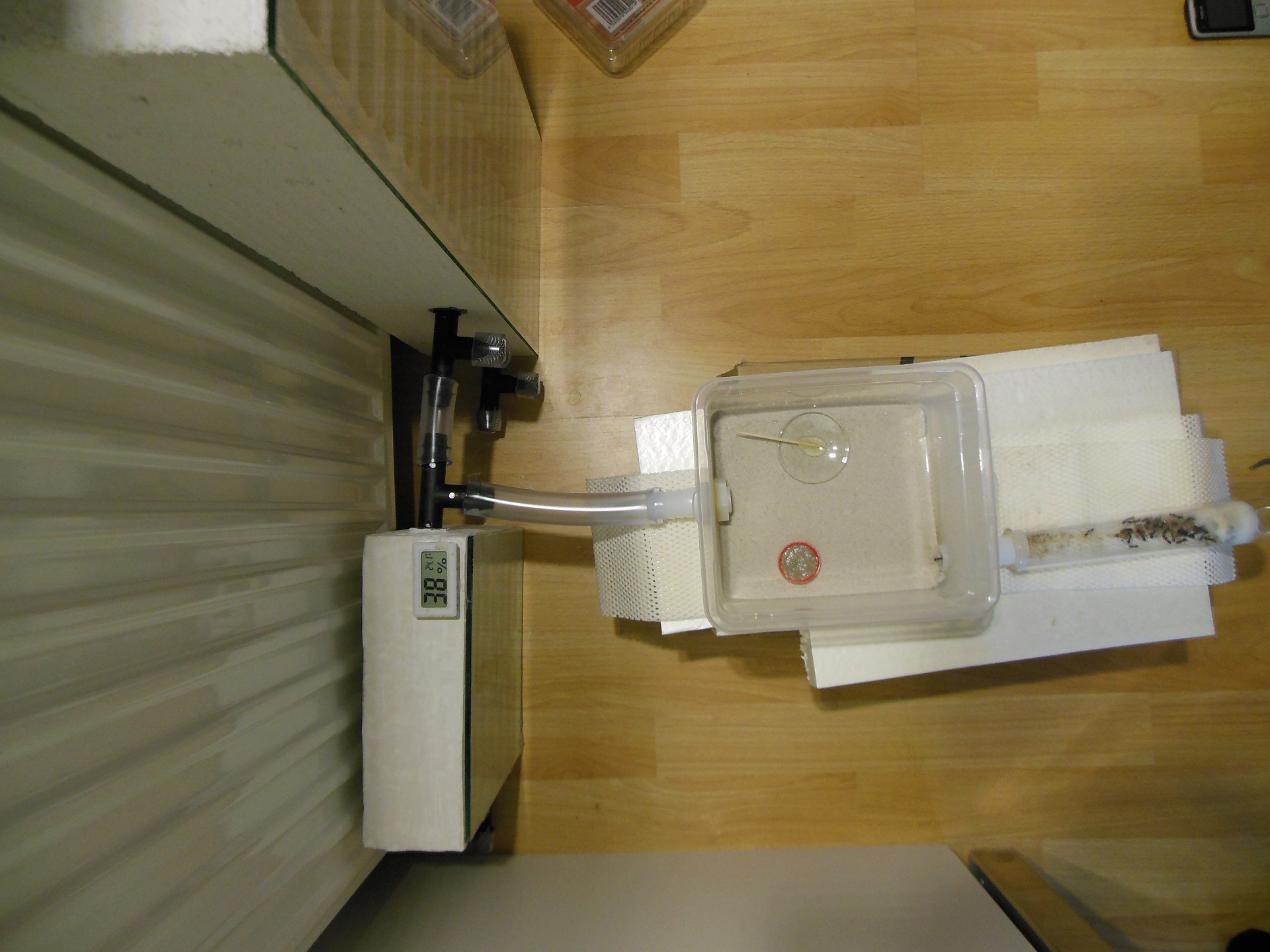 DieKönigin und die Larven blieben zunÀchst weiterhin im RG bei eher niedrigen Temperaturen. Im Zimmer ist es relativ kalt, obwohl die Heizung an war. Hierdurch habe ich die Ameisen aber schon etwas gezwungen das Nest zu wechseln. Ich hoffe nur, dass nicht beide Nester unpassend waren. SpÀter aber dazu mehr.