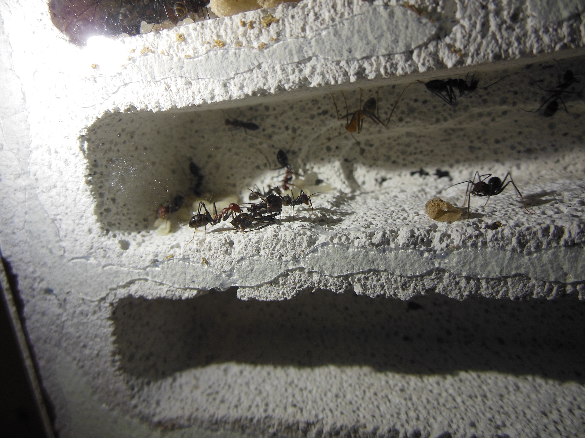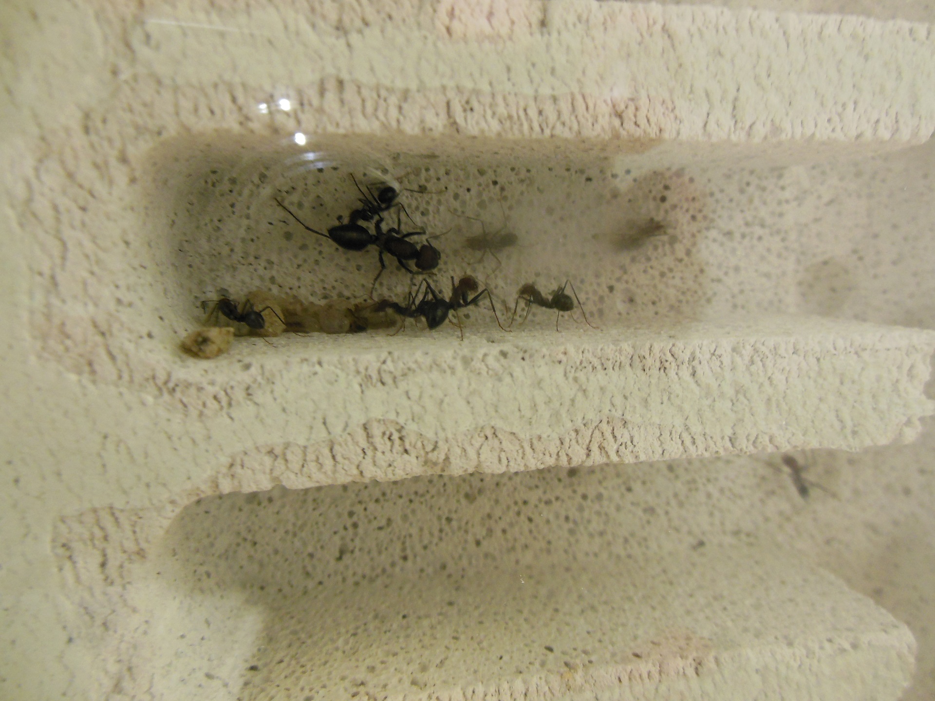 Vereinzelt wurden auchPuppen in den Y-Tong Stein gelegt. Dort hat sich aber in zwei Kammern Kondenswasser gesammelt. Das war sehr wahrscheinlich die Restfeuchte, da ich den Stein nach der Bearbeitung grĂŒndlich gewaschen habe. Der Staub soll ja giftig fĂŒr die Ameisen sein.