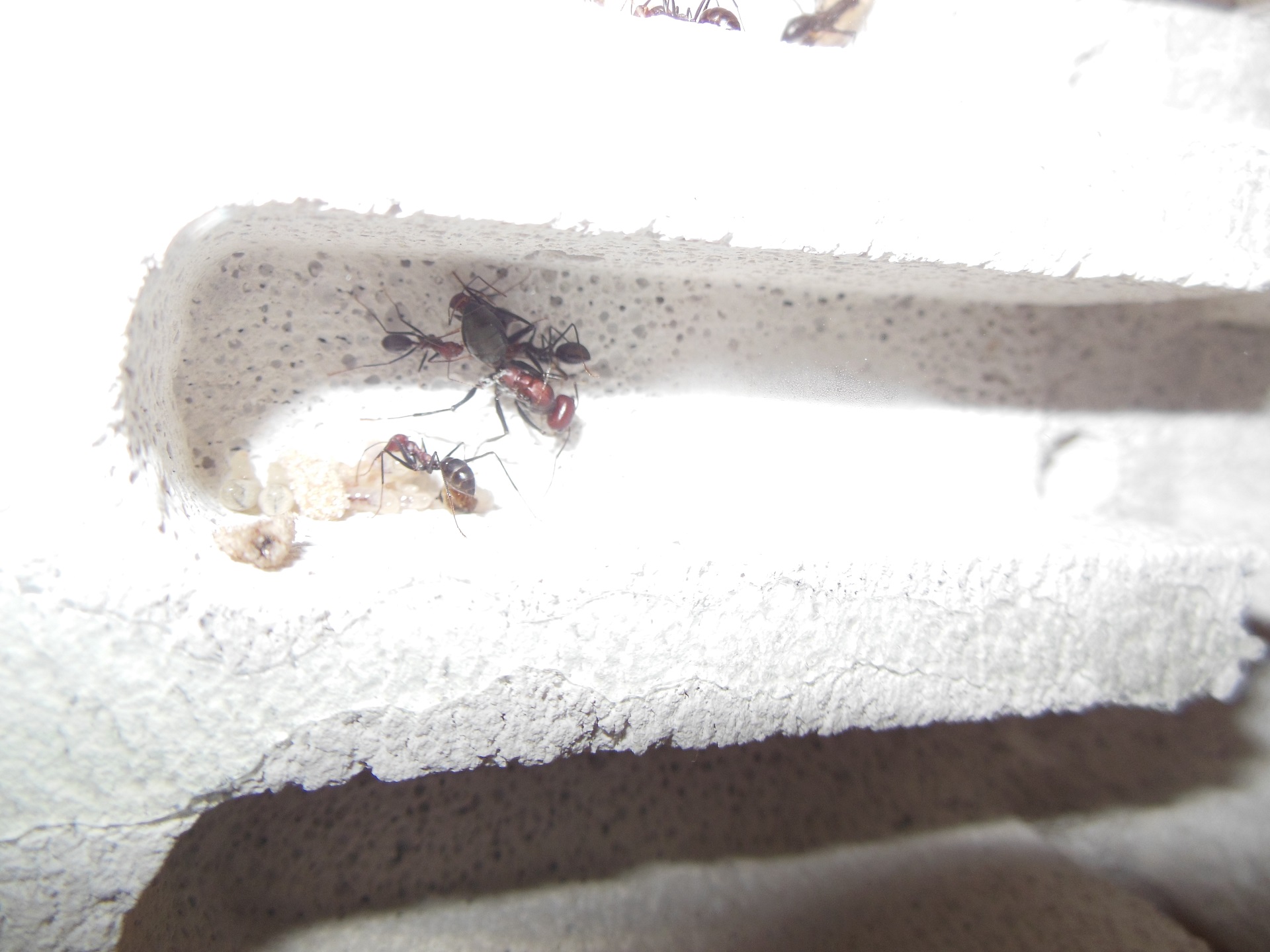 Die Arbeiterinnen liefen aber stÀndig in beiden Nestern herum und erkundeten alles genau. Einige Stunden spÀter begannen sie allePuppen in den Y-Tong einzutragen.