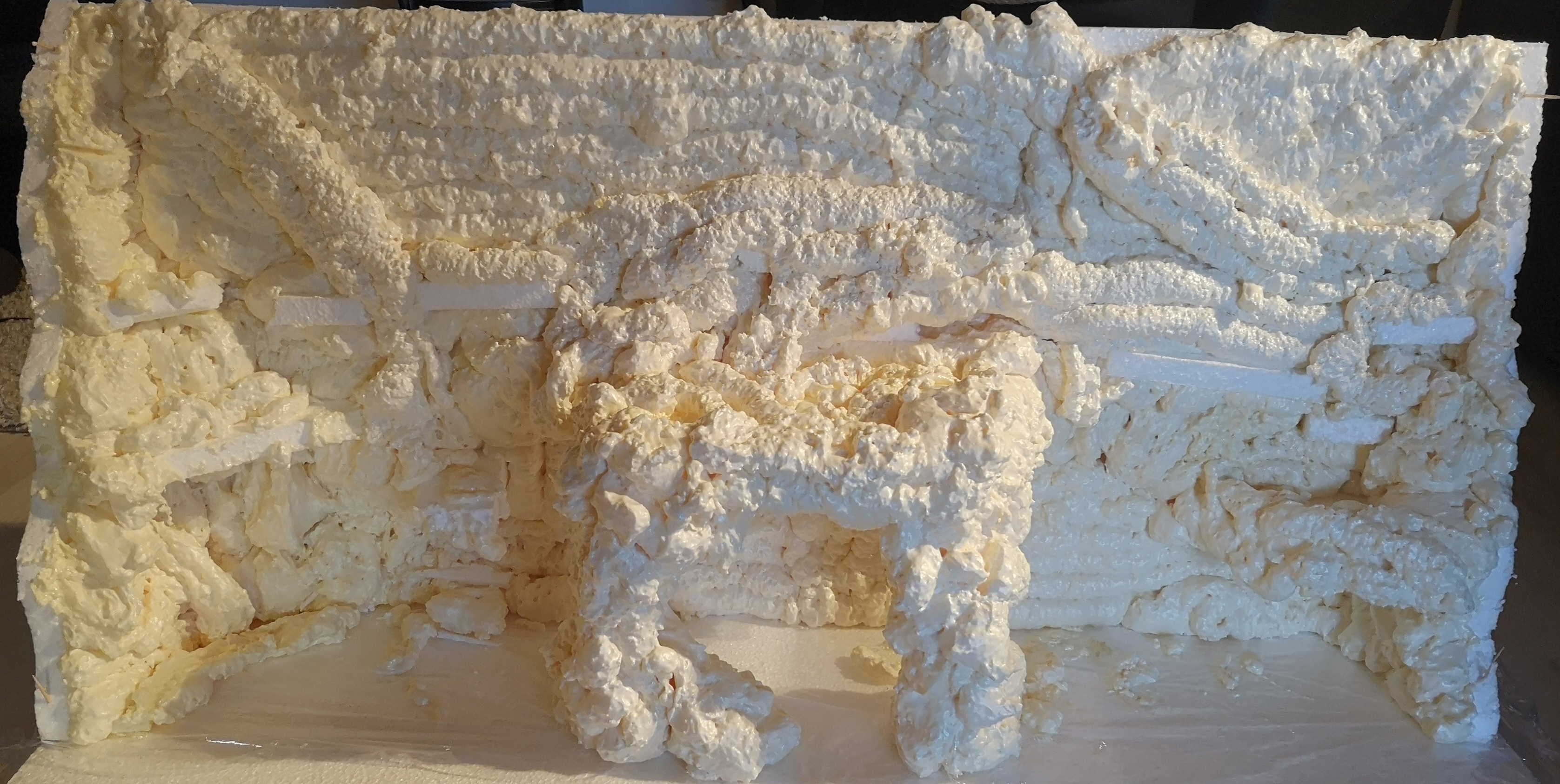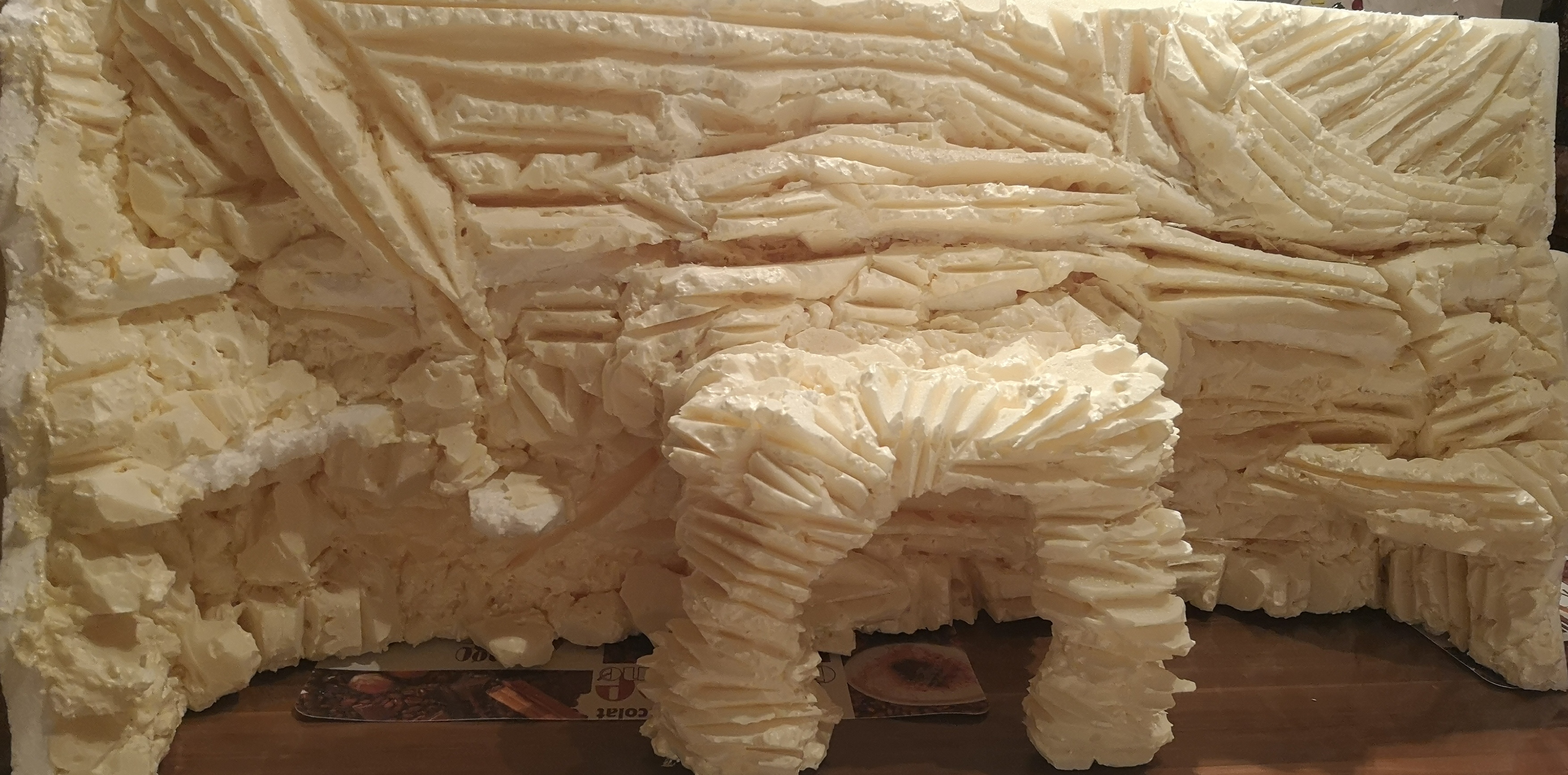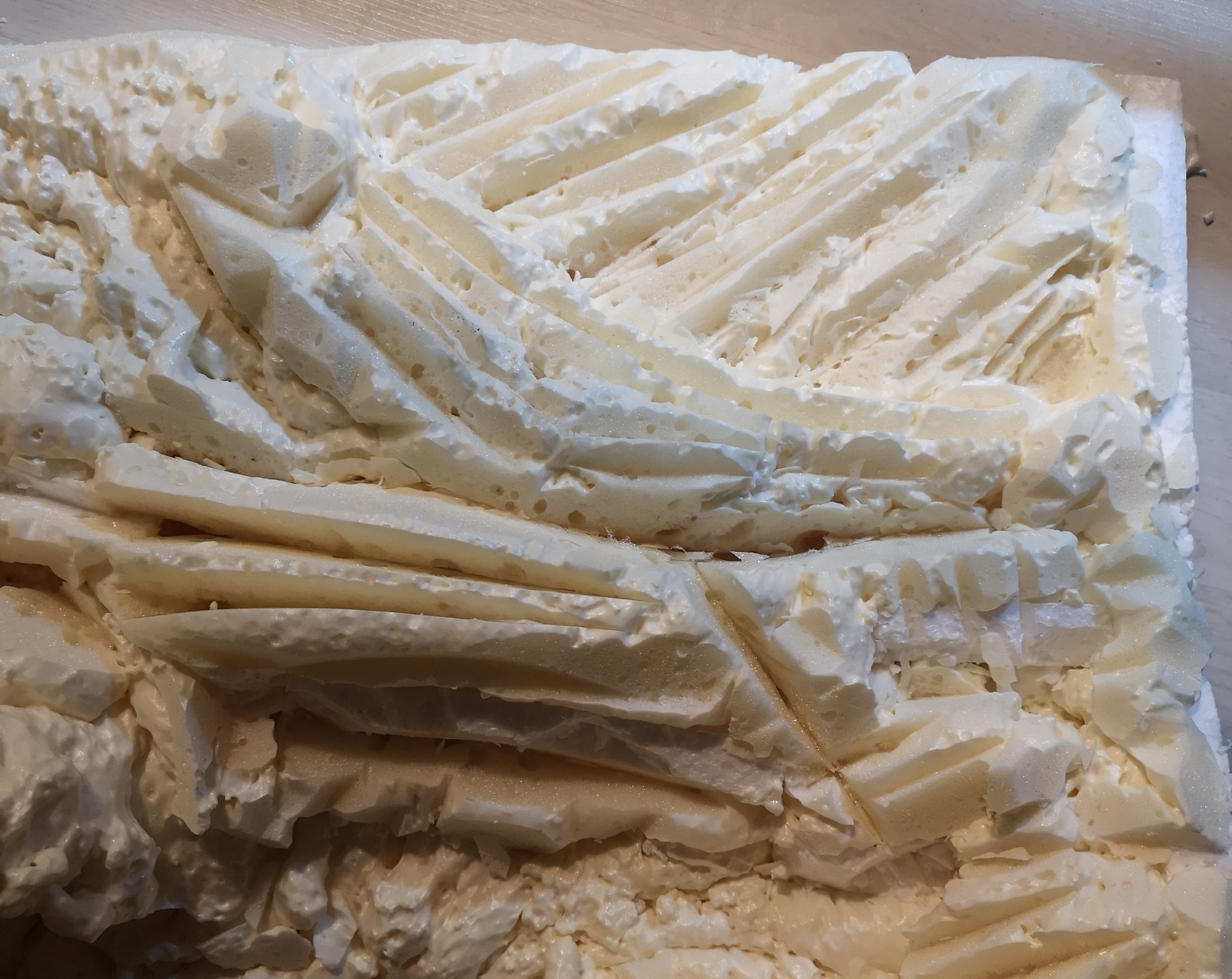 Nach ein paar Stunden ist der Bauschaum ausgehärtet und ich konnte mit dem schnitzen der Felsen beginnen.