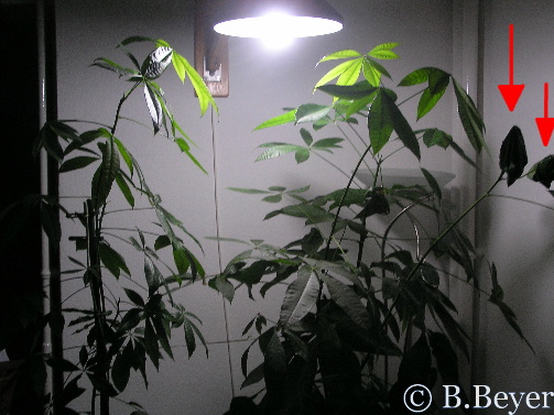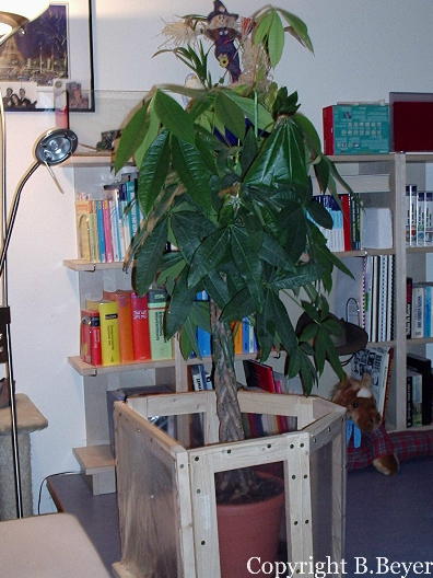 Aufgeregt führ ich nach Hause, nun musste gut überlegt werden, was ich für eine gute Pflege alles benötigen würde. Ich kaufte eine Glückskastanie (Pachira aquatica) mit zwei Untersetzern. Einer für die Bewässerung der Pflanze und ein größerer als Wassergraben, denn immerhin sollten die Weberameisen ja nicht frei in der Wohnung herumspazieren. Ich räumte ein Platz auf meinem Podest frei, rückte die Lampe zurecht und baute alles auf. Nachdem alles hergerichtet war, fehlten nur noch die Ameisen...
