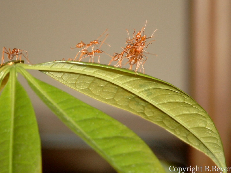 Am Wochenende darauf lud ich meine Examens-Lerngruppe zum Plausch bei Kaffee & Kuchen ein und siehe da, als würden die Ameisen auf dieses Puplikum nur gewartet haben: das Projekt Nestbau begann. Hin und her gerissen wandelte ich zwischen Konservation und Ameisenbaum, um den Nestbau dokumentieren zu können. Vermutlich wurde das Verhalten durch einzelne Ameisen ausgelöst, die sich als "lebende Brücke" zwischen zwei Blatträndern festklammerten. Eine weitere Arbeiterin gesellte sich hinzu und noch eine und noch eine... Mit gemeinsamer Kraft zogen die Ameisen die Blätter zusammen. Fasziniert betratete ich das Treiben, erschien es doch so als würde diese Aufgabe mit Leichtigkeit bewältigt. Vergleichbar mit dem Bau der Pyramiden, ist der Nestbau in bezug auf ihre Körpergröße ein wahres Wunderwerk an kooperativer Arbeitsteilung. Ich fragte mich ob es eine "Bauleiterin" gibt, die das Bauvorhaben stets im Auge behält und koordiniert? "Weiß" jede einzelne Arbeiterin, wie das Endprodukt aussehen soll oder erfüllt sie nur die Aufgaben, die aktuell benötigt werden? Dies sind Fragen auf die es wohl keine Antworten geben wird und auch Vermutungen wären an dieser Stelle unbrauchbar, würde ich mich doch auf meine erstmaligen Beobachtungen berufen. Doch es erscheint als würde jedes kleine Gehirn der einzelnen Arbeiterinnen imaginär verbunden und somit zu Höchstleistungen befähigt, welches so schön in der Fachliteratur als Superorganismus bezeichnet wird. Diese kollegtive Intelligenz oder auch wissenschaftlich Schwarmintelligenz befähigt sie zu Leistungen, die für uns so fasinierend komplex und hochdiffenrenziert kaum vorstellbar von einem solch kleinen Insekt zu leisten sind.