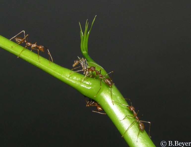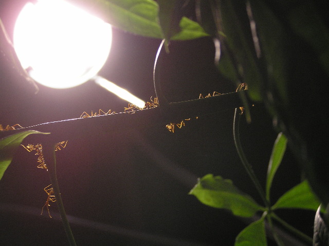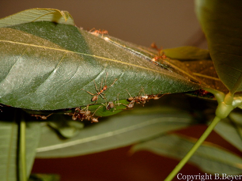 Mit beeindruckender Geschwindigkeit ging es vorwärts, einzelne Blätter waren bereits nach einigen Stunden zusammengebracht und so rückten die ersten Arbeiterinnen-Kolonnen mit Larven an. Ein nächster erstaunlicher Punkt bei dieser Art: Normalerweise würden sich die Larven in einen Kokon einwickeln, in dem sie die Metamorphose zum adulten Insekt vollziehen. Bei den Weberameisen spielt dieses Entwicklungsstadium jedoch eine entscheidende Rolle beim Nestbau. Sie spenden den "Klebstoff", um die Blätter ihrer zukünftigen Behausung zu verbinden. Die Larven werden zwischen den Mandibeln gehalten und mit den Antennen betrillert, welches sie veranlasst ihr seidiges Sekret abzugeben. Mit seitlichen Bewegungen zwischen den Blatträndern hin und her wird das Nest nun verwoben und erhält seine Stabilität. Doch in der Natur geschieht nichts aus reiner Selbstlosigkeit, denn in diesem Nest werden auch die Larven einen Platz finden, der ihnen Sicherheit bietet und wo sie versorgt werden.