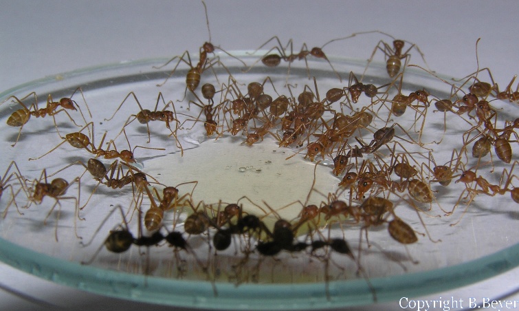 Zu Beginn habe ich das Honigwasser auch noch auf einen Wattebausch geträufelt, bin davon aber abgekommen. Die Ameisen können das Honigwasser niemals vollständig aufnehmen und im Sommer ist dann ruck zuck der Wattebausch steinhart. Die Ameisen haben sich bereits umgestellt und "umkreisen die kleine Pfütze". Es dauert keine 5min und schon ist ein Großteil der Scouts auf dem Vormarsch zum Futter. Wenn kein Platz mehr ist wird hochgestapelt. In diesem Punkte sind die Geschwister untereinander recht genügsam, sie nehmen andere "Huckepack" lassen geduldig auf sich herumgekrabbeln, nur damit auch die anderen Schwestern an den süßen Saft gelangen können - wie zuvorkommend aufmerksam und umsichtig - einen Aspekt, den wir vielleicht mehr verinnerlichen sollten [Wenn es bei uns etwas kostenlos gibt, ist eher Rangellei, Gier und Neid in den menschlichen Verhaltenszügen zu erkennen und nicht das Motto "Es ist genug für alle da - es wird fair geteilt!"]