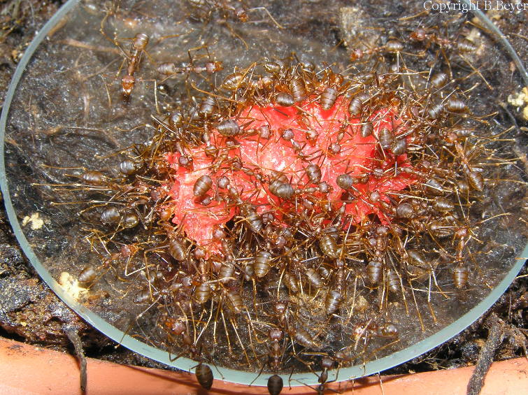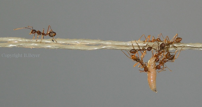 Beim Überwinden von Lebendnahrung kann es immer passieren, dass eine oder mehrere Arbeiterinnen ihr Leben geben müssen. Eigentlich ein natürlicher Prozess. Diese natürliche Selektion hatte ich noch zu "meinen Gunsten" (wenn man das überhaupt so sagen darf) manipuliert und meiner damals noch jungen Kolonie anfänglich die Maden zerteilt. Mittlerweile erhält die nun mehr als dreimal so große Weber-Kolonie jedoch alle Futterinsekten in einem Stück. Sicherlich wird dadurch das Lebensalter einiger Arbeiterinnen verkürzt, und eigentlich tut es mir in der Seele weh, aber ich möchte meinen Weberameisen eine so weit wie mir das möglich ist, artgerechte und naturgetreue Lebensweise bieten und das Leben in der Natur spielt nun mal nach seinen eigenen Regeln!