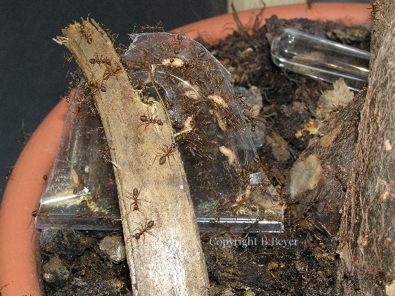 ...den Behälter mit Schraubverschluss stellte ich auf den Blumentopf. Mein Freund öffnete den Deckel und ersichtlich aufgeregt kamen ihm gleich einige Ameisen entgegen. Es dauerte eine Weile bis sich die ersten Arbeiterinnen herauswagten, um ihr neues Zuhause zu begutachten. Dies taten sie dann aber sehr genau: Es erweckte fast den Anschein als würden sie eine innere Landkarte der Pflanze erstellen, indem Zentimeter für Zentimeter abgelaufen wurde. Nach etwa zwei Tagen nahmen wir das alte Nest aus dem Behälter, heftig wurde die Pinzette attackiert, greifte sie doch in das heilige Revier der Ameisen ein, der Wohnort der königlichen Hoheit.