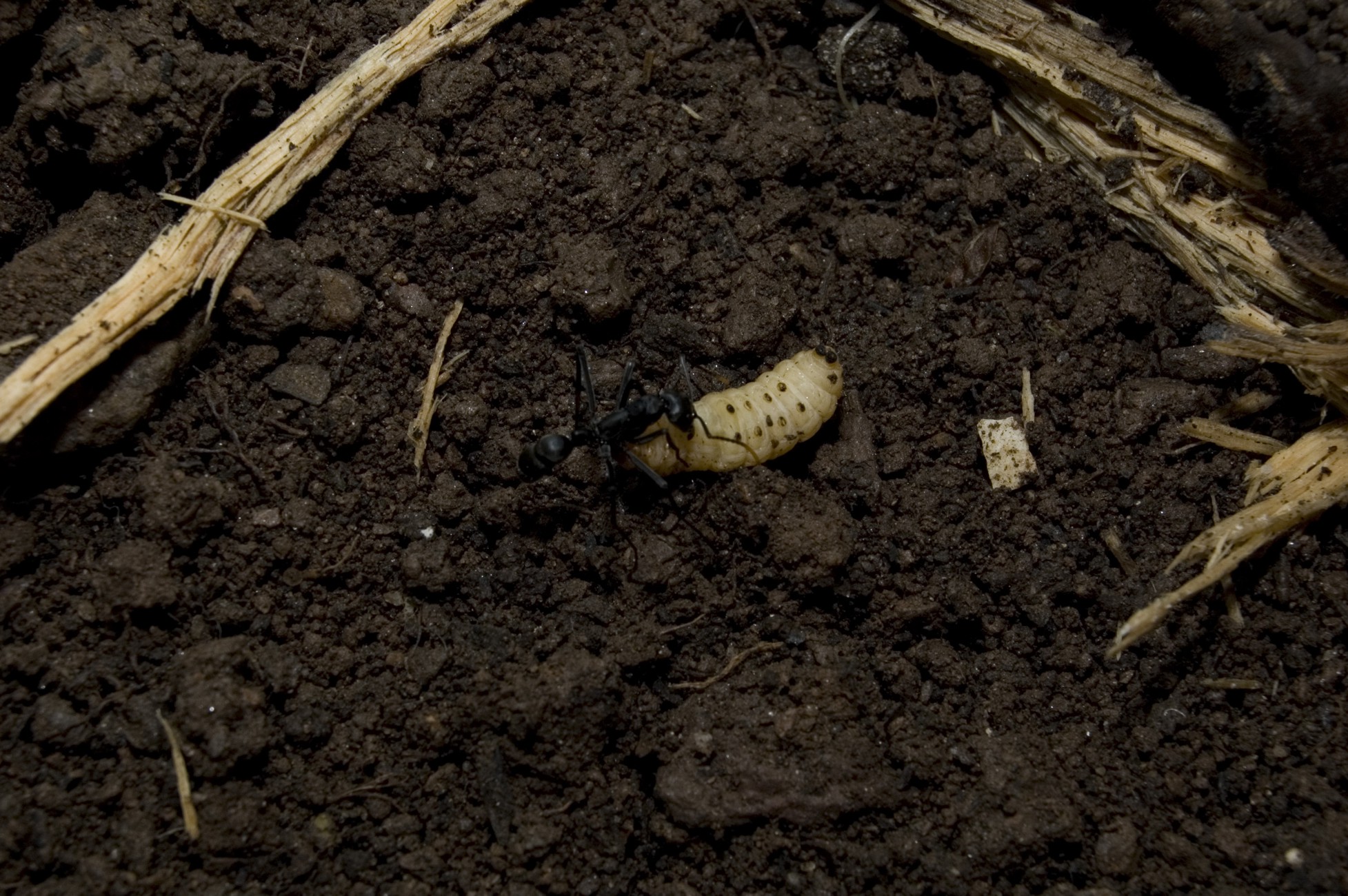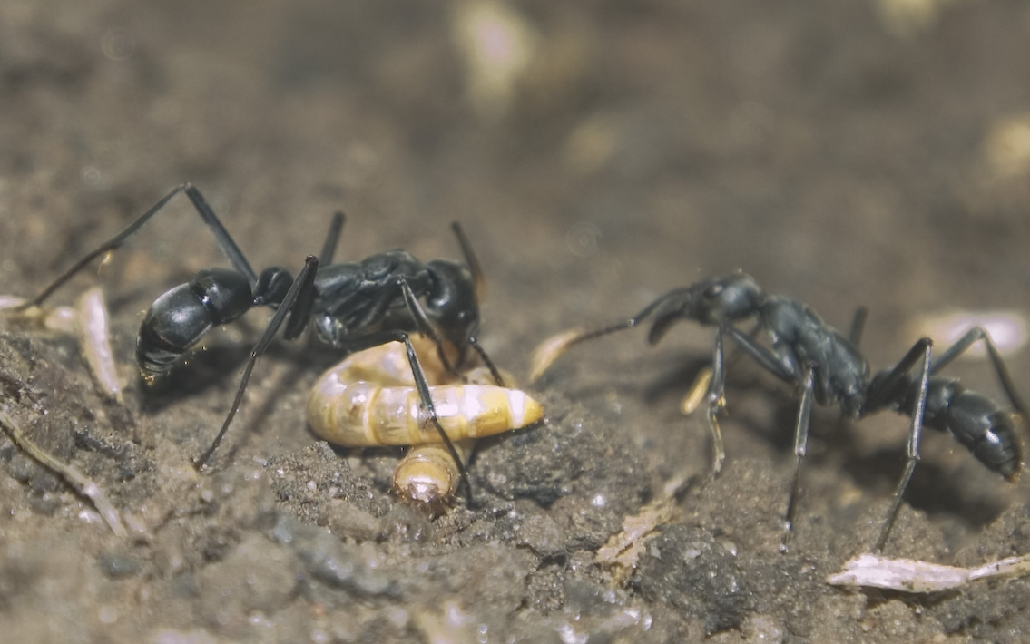 Die Mehlwürmer nehmen sie am liebsten lebendig an. Sie greifen sie an, und ziehen sie aus der Erde heraus. Der Mehlwurm wirft die Ameise um sich, während sie versucht den Stachel anzusetzen. Das ganze dauert meistens ca. 5 Sekunden, ab dann bewegt sich der Mehlwurm nicht mehr -wirksames Gift!