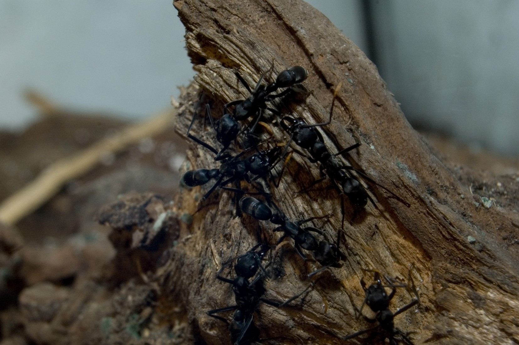 Gestern kam mein Verkäufer mit einem 60x30x30cm Becken an und brachte mir wie versprochen die Pachycondyla apicalis Kolonie mit. Haben gleich gecheckt ob es der Königin gut geht oder ob es Probleme mit weiteren Parasiten gibt. Wir konnten soweit nichts feststellen.