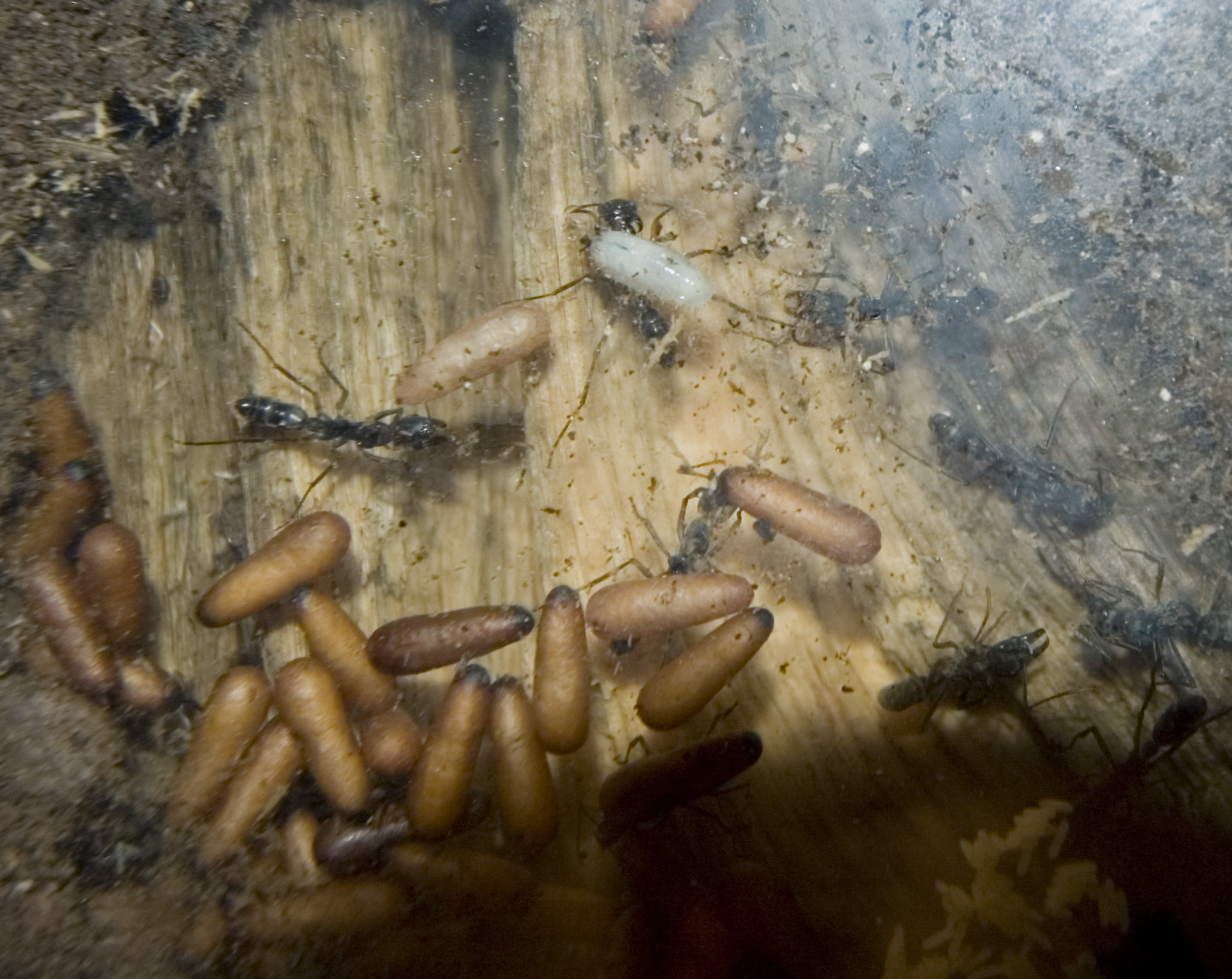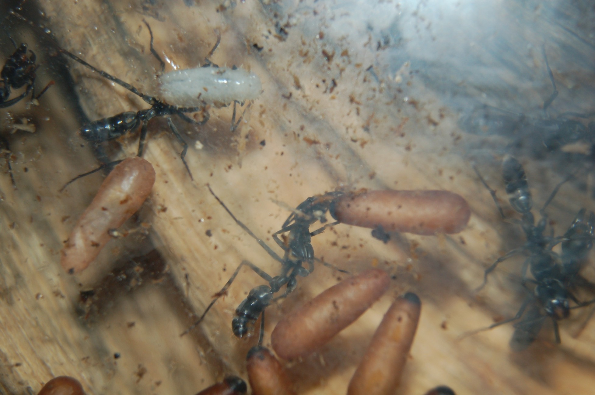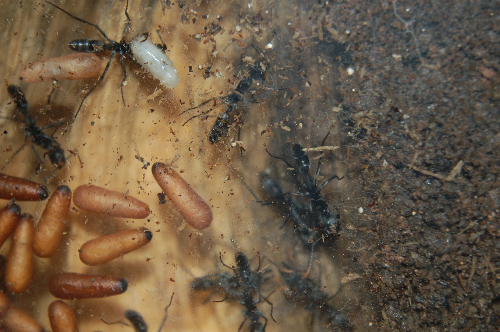 Zu erkennen sind natürlich Puppen, kleine und große Larven, die bei Pachycondyla apicalis behaart aussehen und die kleinen stäbchenförmigen Eier.