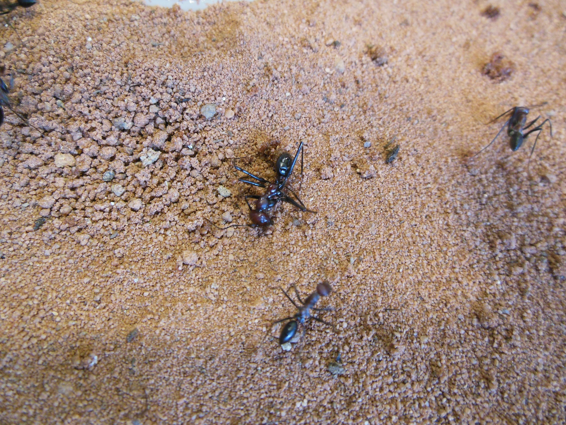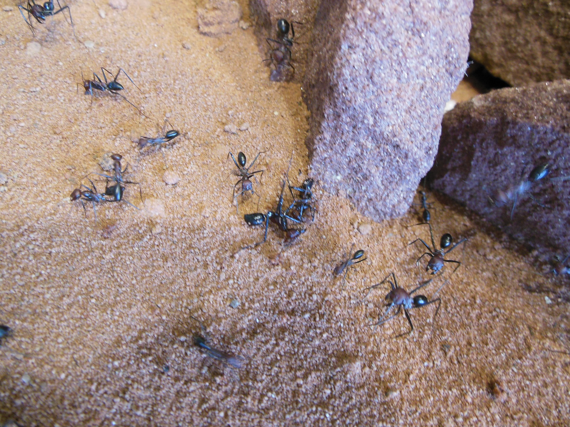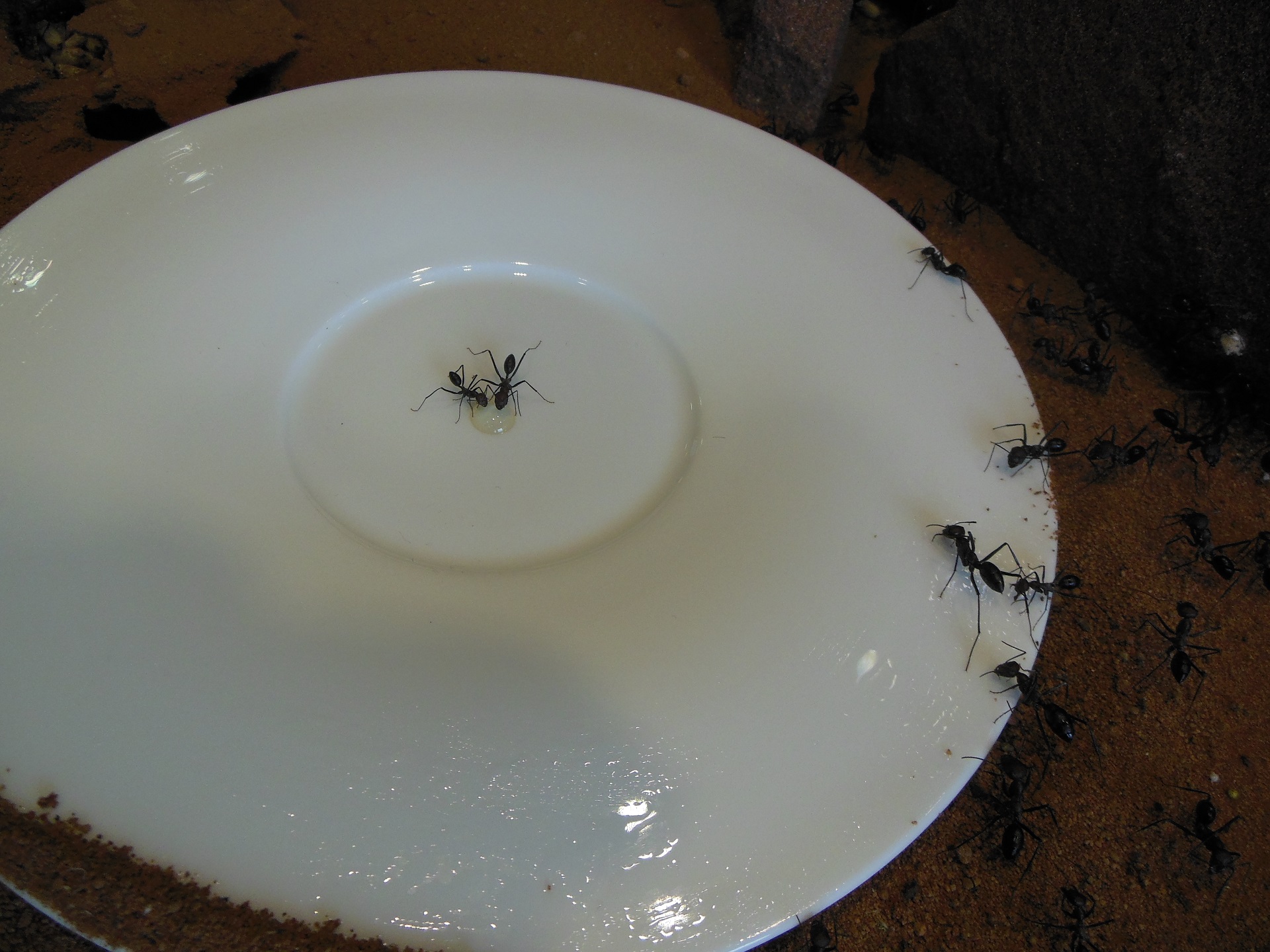 Ich habe in der Zwischenzeit auch mal eigene Versuche zu Paraffinöl gemacht. Getestet wurde es allerdings nur mit Cataglyphis oasium. Dabei habe ich einen Teller genommen und waagerecht mit Öl eingeschmiert. In der Mitte habe ich Honig angeboten und beobachtet. Die Ameisen betasten tatsächlich den Film und werden davon abgeschreckt und sammeln sich um den Teller herum. Immer wenn die Ameise mit den Fühlern das Öl berührt, kehrt sie um.