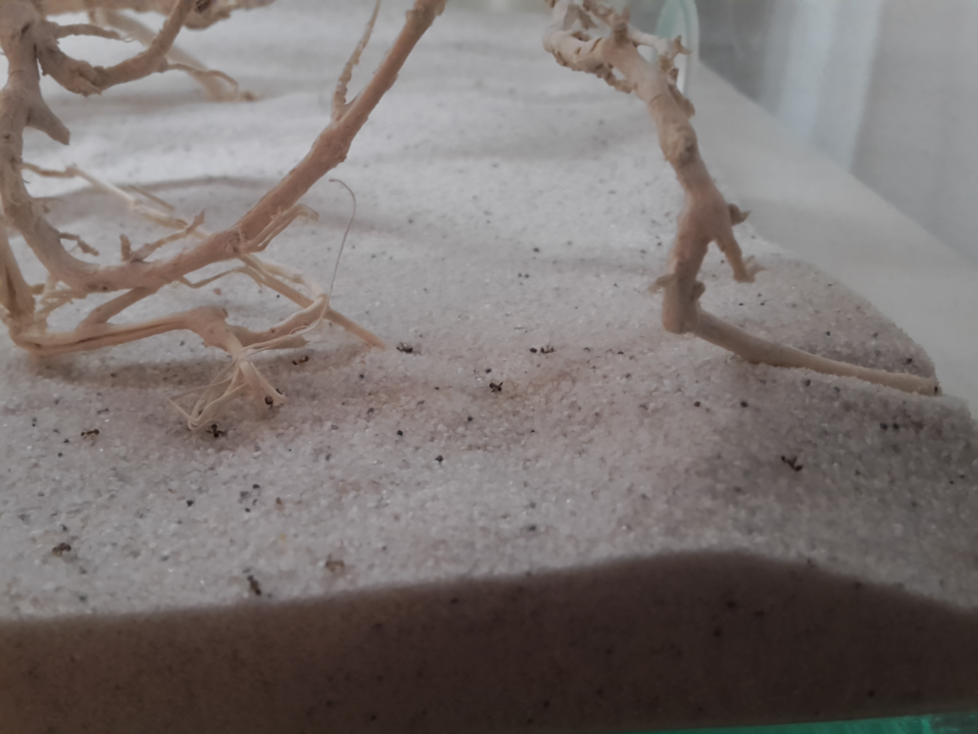 Die Arbeiterinnen haben begonnen die Leichen wieder aus dem Nest zu tragen und an den Seiten in der Arena und in Vertiefungen zu legen. Deshalb haben wir neben dem Nest und neben der Tränke eine Vertiefung gemacht in der Hoffnung, dass die Ameisen diese als Müllhaufen verwenden. Wir wollen den "Müll" schließlich entsorgen.