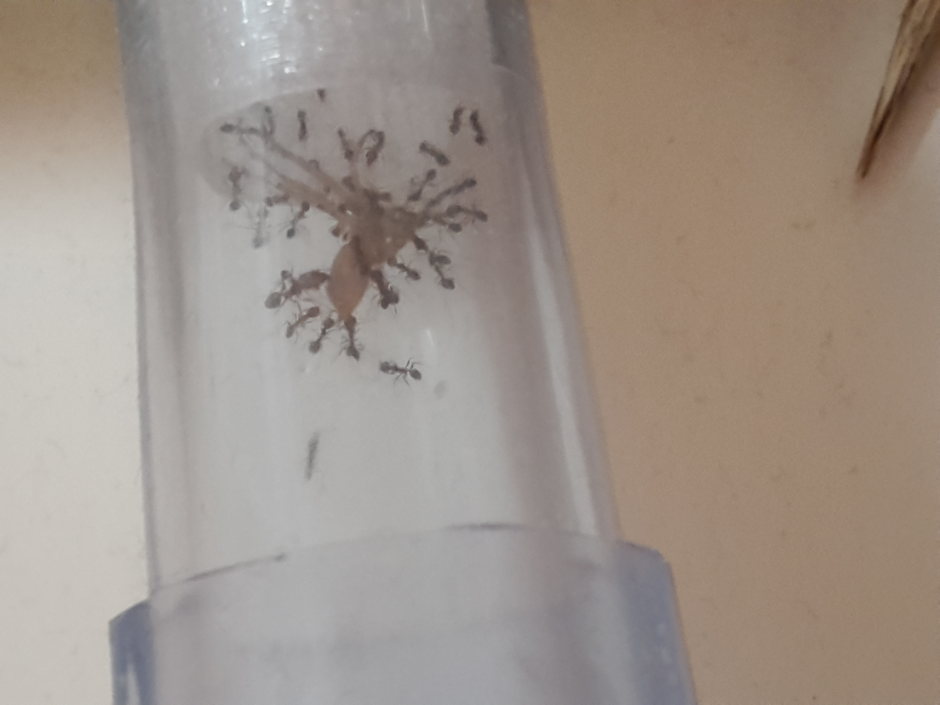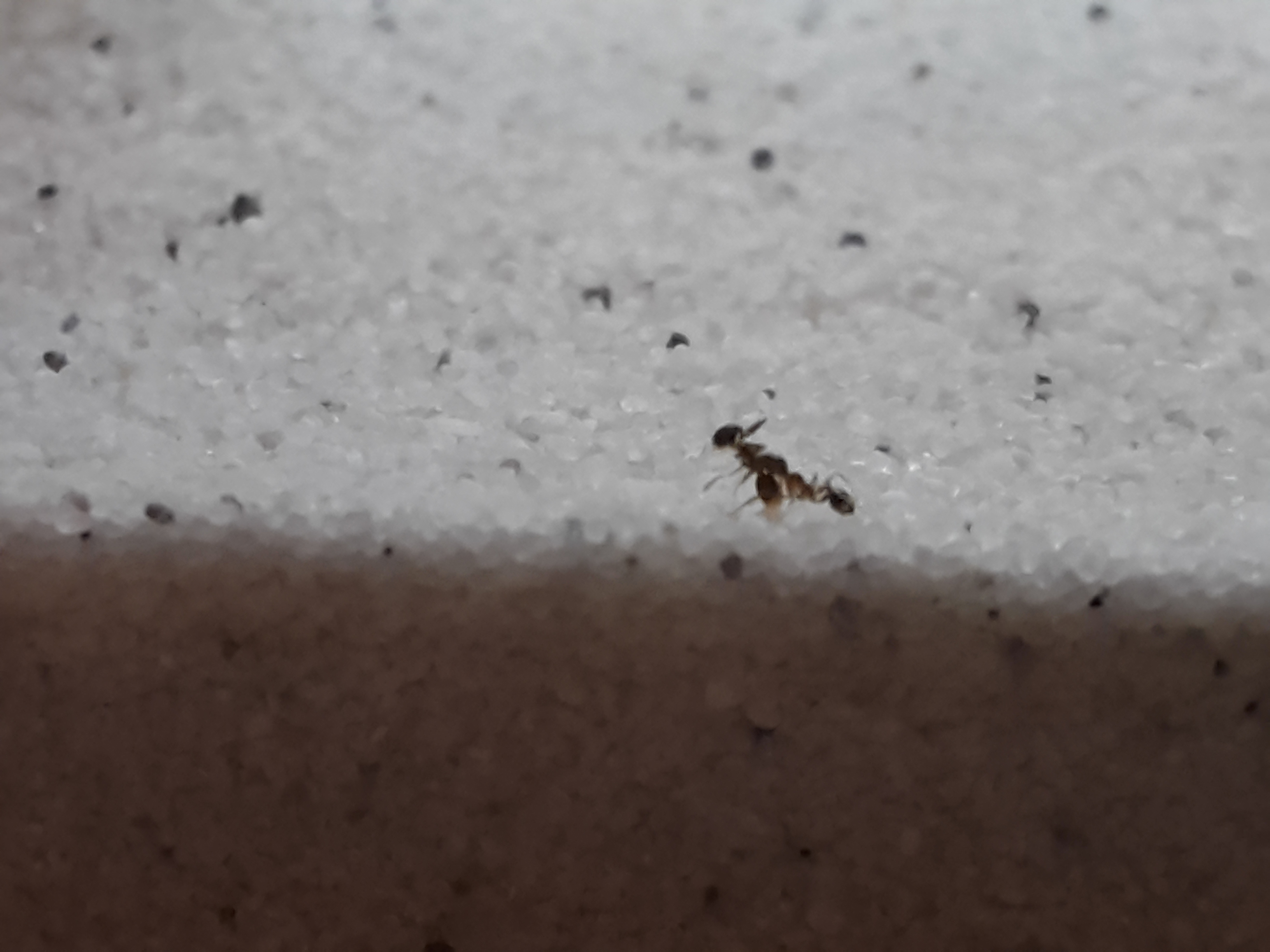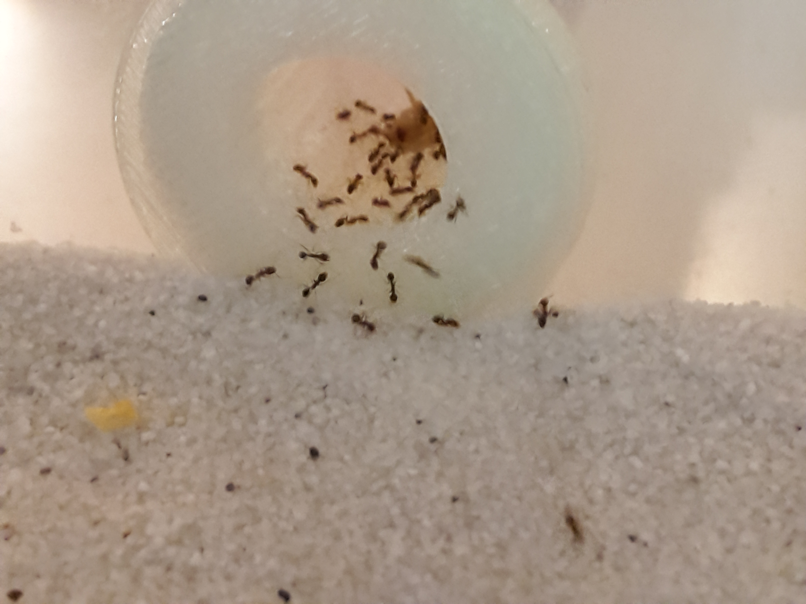 Wurden heute geliefert. Trotz der Größenangabe des Händlers hat uns die Größe dann doch überracht! 3 Gynen, 150-200 Arbeiterinnen, 4 Majore und reichlich Brut (welche diese Ameisenart übereinander stapelt) wurden geliefert.Leider hatten wir an die 30 Transportleichen. Nach herausziehen der Watte ging der Zirkus auch schon los! Wie eine Horde ausgehungerter Wildhunde jagten ganze Scharen über den Sand. Wie wir hörten ist diese Art besonders talentiert bei Fluchtversuchen. Brav hatten wir den Rand mit Talkum angepinselt und großzügig aufgetragen. Nach gefühlten 2 zwei Sekunden hatte die erste Ameise die Schicht überwunden und Freiheit geschnuppert. Zusätzlich dazu haben wir nun noch eine Schicht Paraffinöl aufgetragen und den Deckel aufgesetzt. Hoffentlich erwarten uns morgen keine bösen Überraschungen.