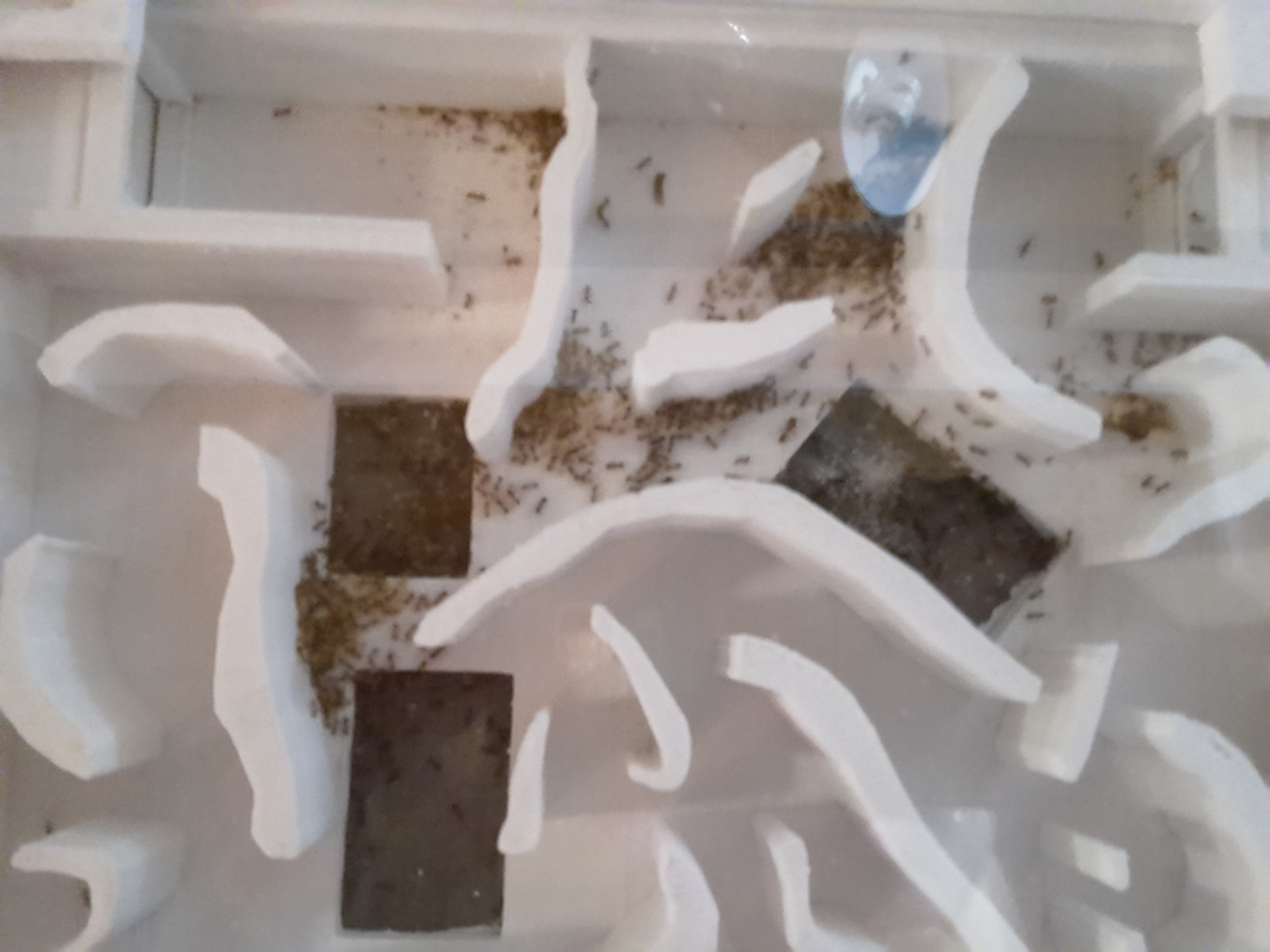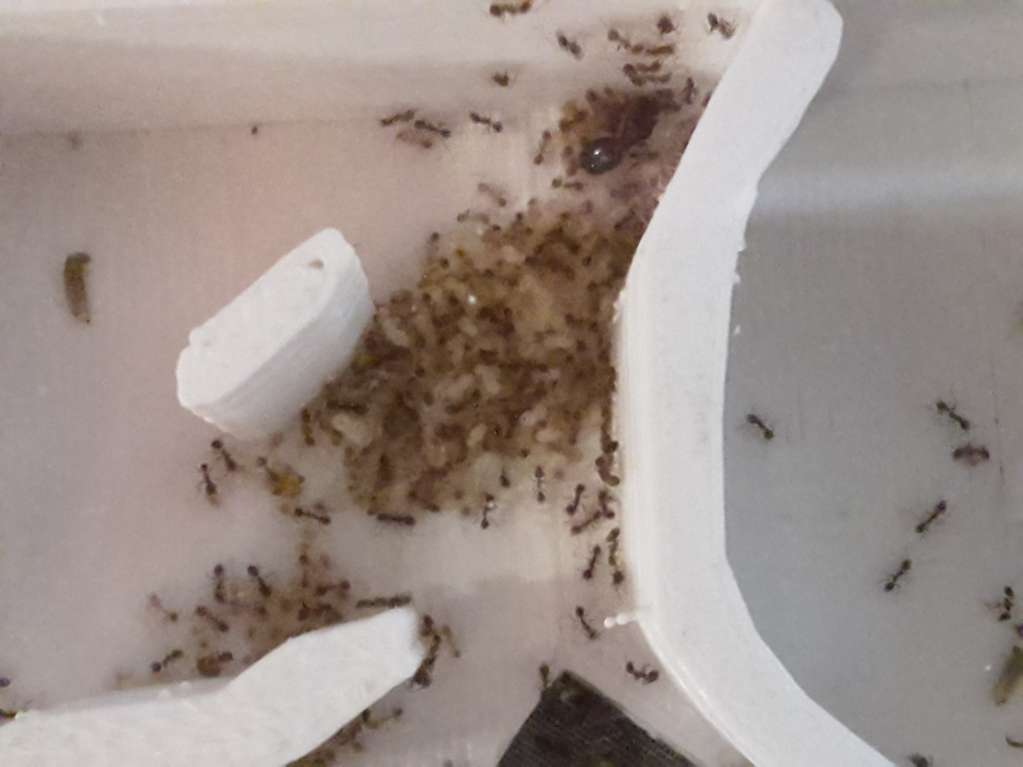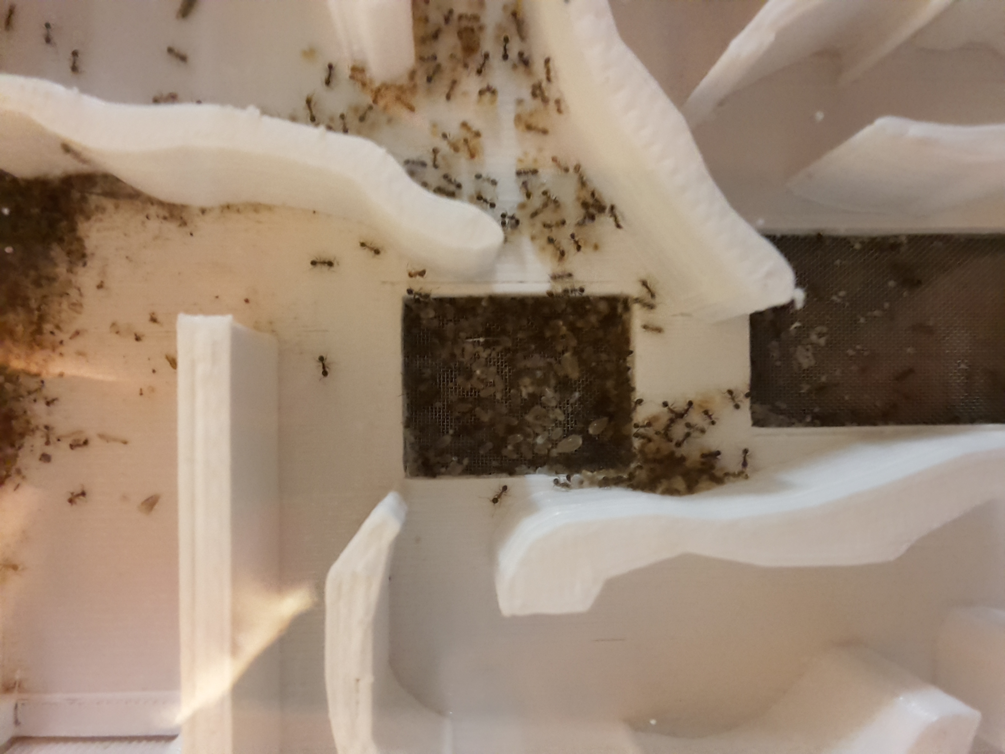 Tag 7. Unsere Damen haben gestern in Scharren das 3D-Nest erkundet (wir haben es zur Heizung gestellt und von unten befeuchtet). Zu erst dachten wir, dass sie das Gitter im Nest irgentwie entfernt haben, um nun einen Ausbruchsversuch zu starten... aber wir lagen Falsch!- Sie sind umgezogen Hier ein paar Fotos während des Umzugs: