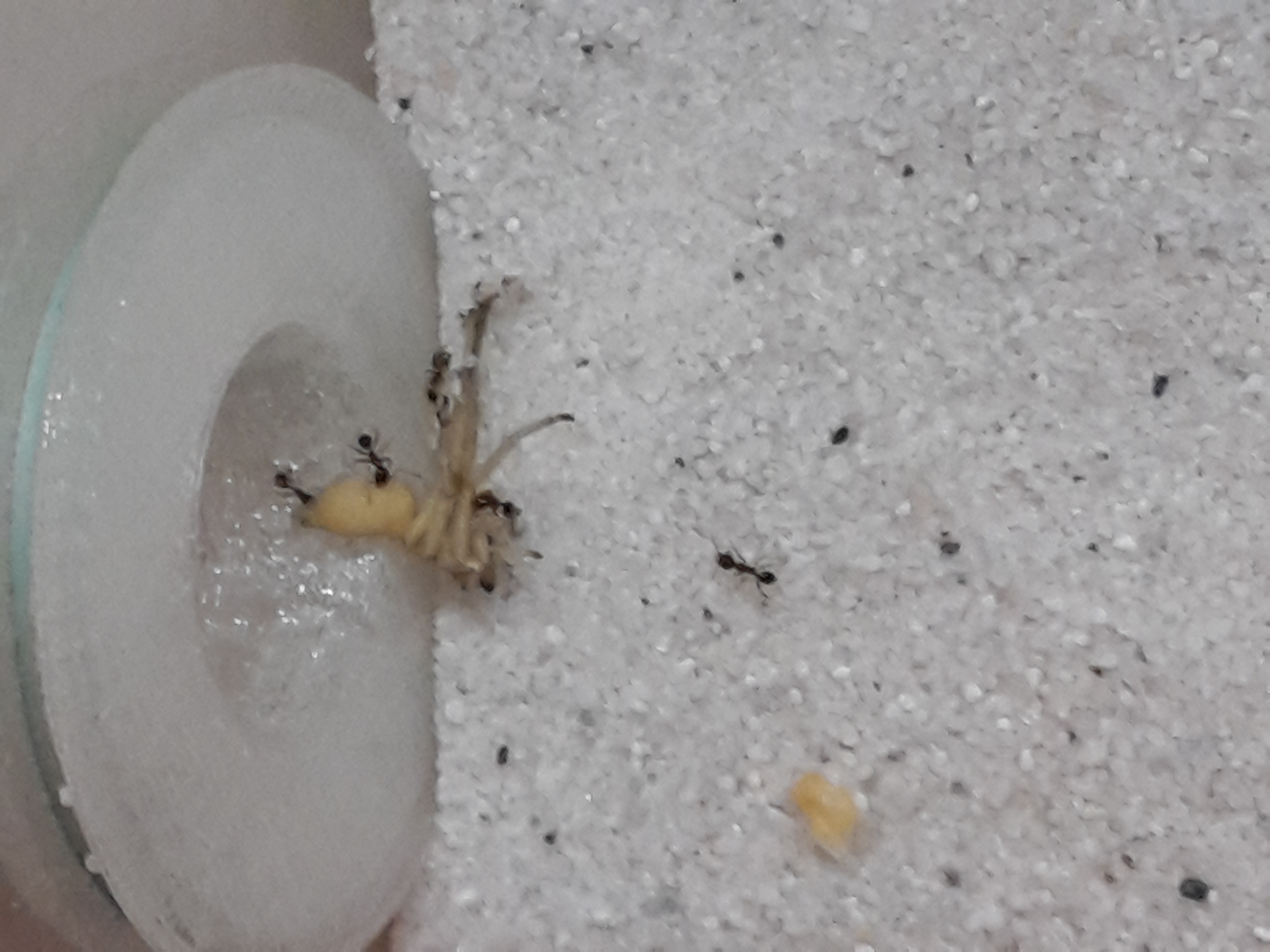 Unsere Damen haben heute eine Schabe bekommen und diese auch sofort in Beschlag genommen. Drei Arbeiterinnen transportierten das Bein mit Leichtigkeit Richtung Nest. Danach bildeten sie eine Straße und transportierten kleine Stücke ins Nest. Das Futterjelly wurde links liegen gelassen, anscheinend ist den Ameisen Lebendfutter lieber.Nach und nach tragen die Ameisen Sandkörner zur schabe und überdecken diese, den Grund dafür wissen wir nicht Dieses Verhalten konnten wir jedoch bereits bei anderen Futtertieren beobachten.