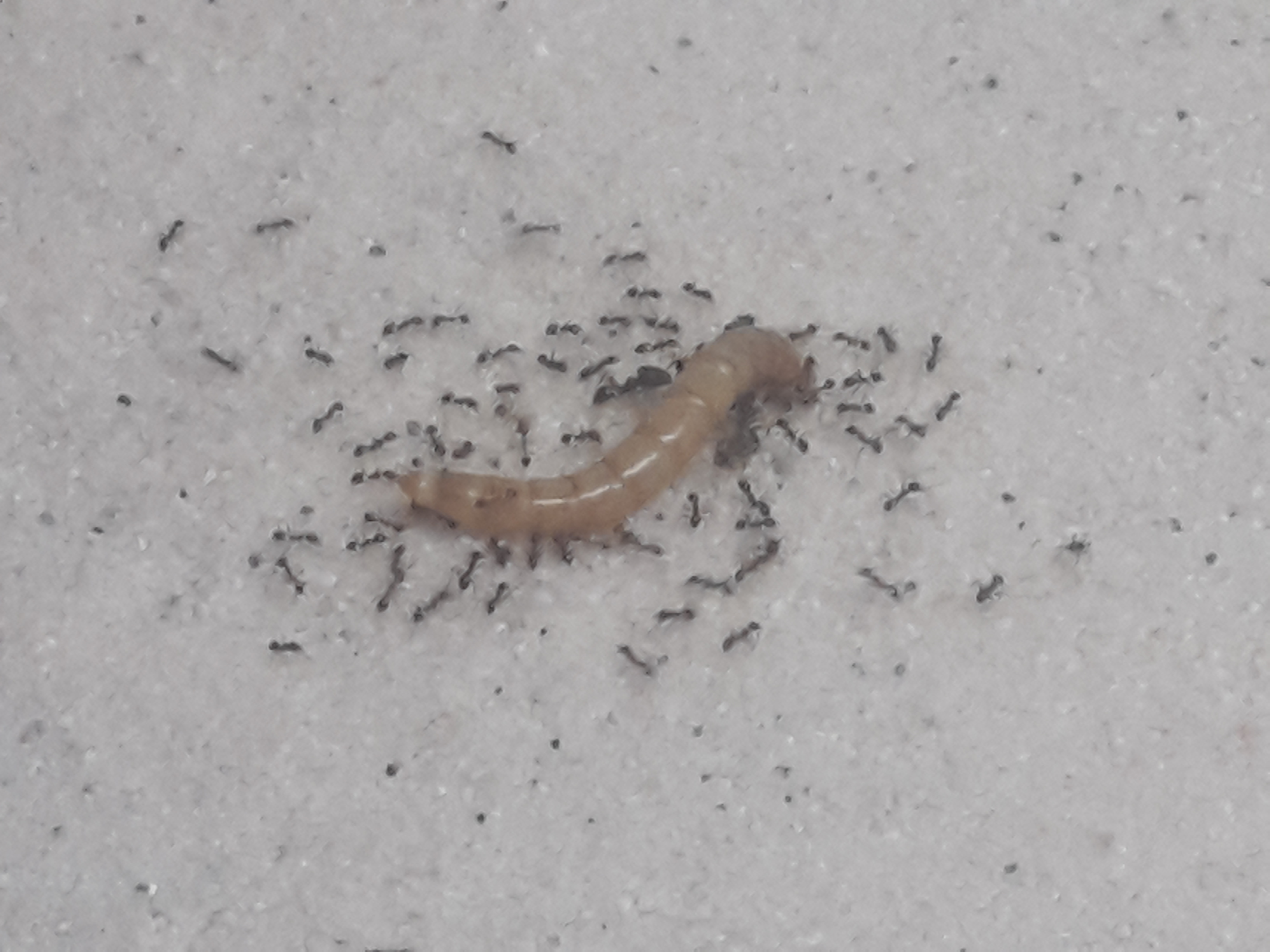 Heute in der Früh haben sie die Tiere ein Stück Richtung Nest gezerrt. Wir haben die Tiere natürlich vorher überbrüht und in der Mitte zerteilt um den Ameisen die Arbeit zu erleichtern.