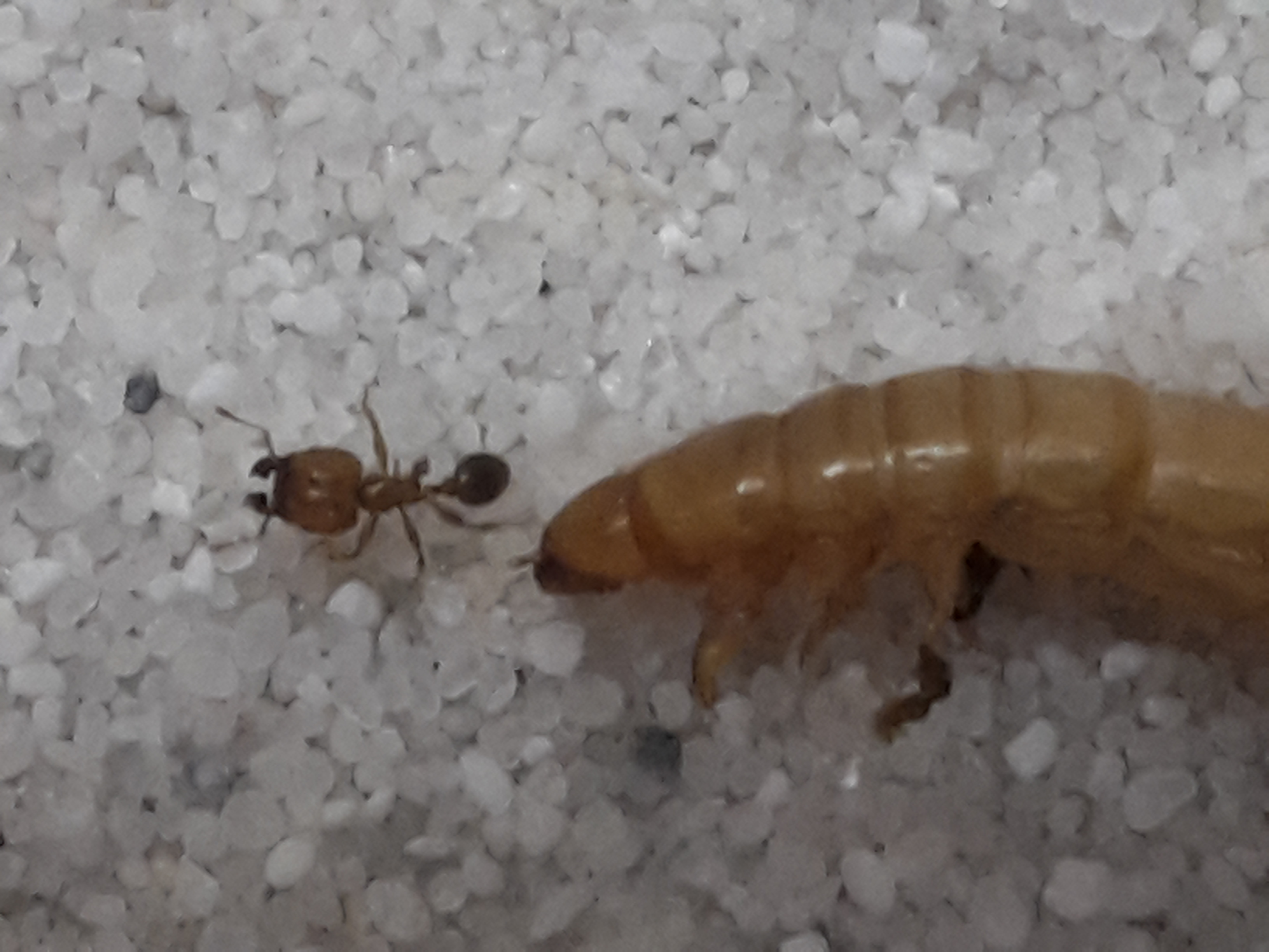 Den Ameisen scheint es im Gegensatz zu anderen Arten nichts auszzumachen, wenn die "Beute" etwas länger liegt. Sie zerlegen nach wie vor die Tiere und saugen diese aus. Der Mehlwurm von gestern bestand nur noch aus seiner Haut! Egal zu welcher Tageszeit man in die Arena schaut ständig sind die Ameisen aktiv, suchen Futter, zerlegen dieses oder erkunden die Arena.