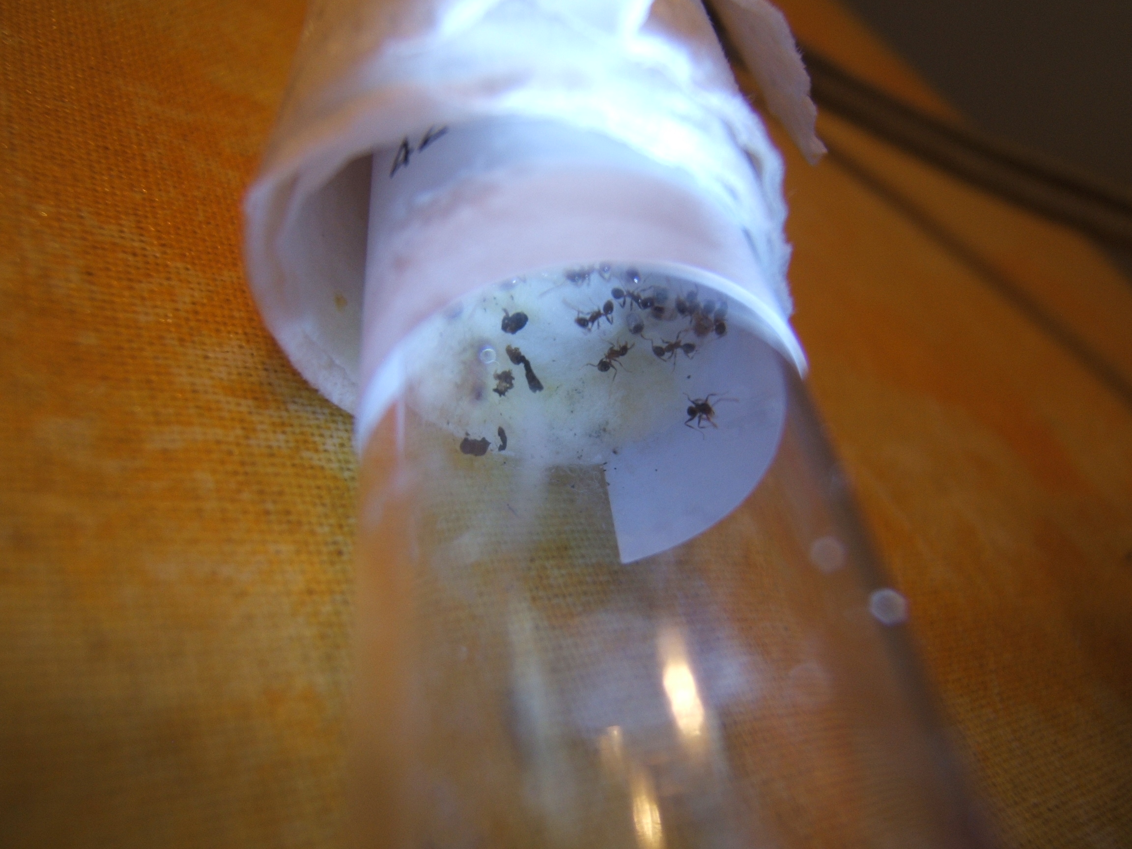 Im Reagenzglas Nest kann ich viel Brut an der Watte erkennen.Muss echt eine menge sein!Sind aber auch kaum zu unterscheiden von der Watte.