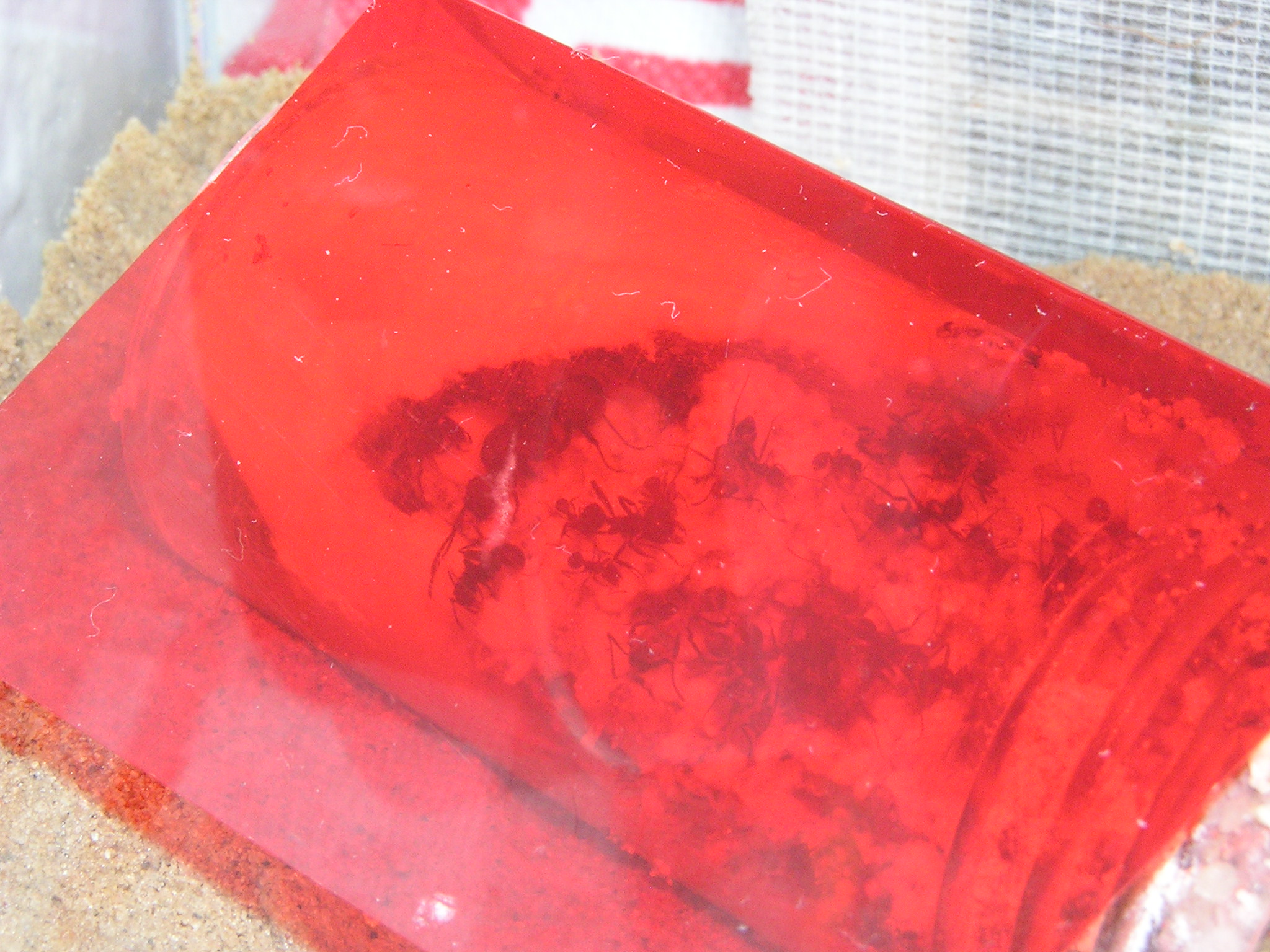 Wie schon erwĂ€hnt, ist der Pilz durch wahrscheinlich zu viel Wasser etwas eingegangen oder verfault. Es ist nicht gerade viel ĂŒbrig geblieben, ich musste alles entfernen. Zum GlĂŒck hatten die Ameisen schon reichlich neuen gezĂŒchtet vorher. Ich habe den Rest der noch ĂŒbrig war in so eine kleine durchsichtige Dose getan mit etwas feuchten TĂŒchern. Ich habe die Dose heute in das neue Pilzbecken gelegt, und mit roter Folie ĂŒberdacht. Die Ameisen tragen schon die ganze Zeit die Watte in kleinen StĂŒcken aus der Dose raus, kann gut sein das sie Platz fĂŒr den Pilz machen wollen weil viel ist nicht mehr. Die Ameisen bauen den Eingang des Röhrchen/Dose mit Sand-Lehm zu, was ganz normal ist. Jedoch habe ich so meine bedenken was das Futterbecken und seine Entfernung an geht. Finden sie das? Ist das nicht zu weit? Es befindet sich keine auf den Stufen, oder in Richtung Verbinder. aber ich denke mal erst wenn sie komplett die Bauarbeiten abgeschlossen haben, und wenn sie wieder Material brauchen dann kommen sie und suchen bis sie finden nach Futter denke ich. Ich brauche mir da bestimmt keine Sorgen machen. Das Ding ist bloss, das viele Arbeiter ja verstorben wahren, und es sind nun nicht mehr so viele Arbeiter wie es sein mĂŒssten. Deswegen habe ich Bedenken, aber es ist viel