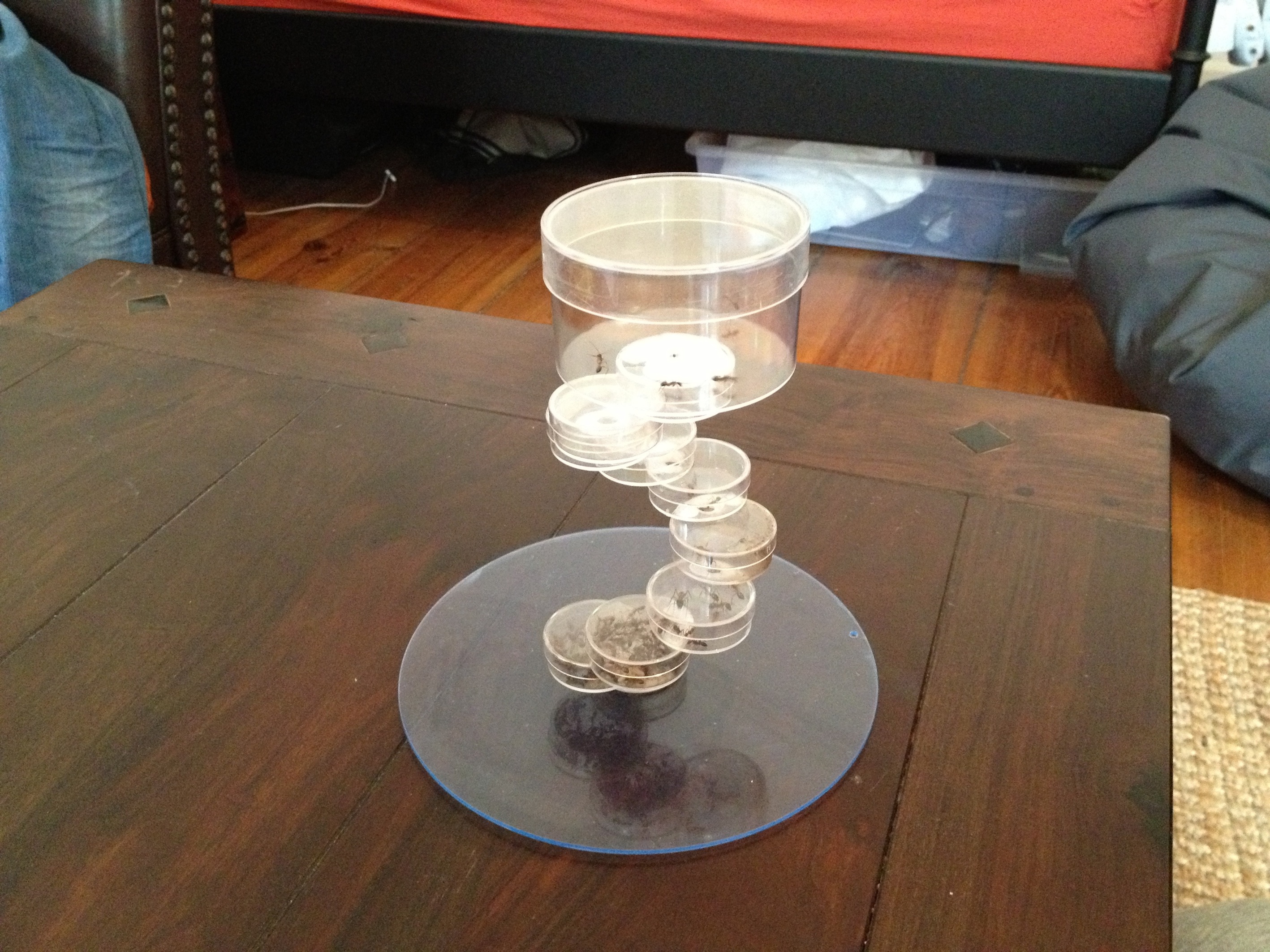 Wenn man aber jetzt eine kleine Schickt Erde oder Sand (bei gelben Solenopsis wegen der Sichtbarkeit eher Erde) auf den Gips aufbringt und dann die Scheibe auflegt hat man eine Ebene, in der sich nur die solenopsis bewegen können. Dort können sie ihre verĂ€stelten GĂ€nge bauen, und man wunderbar die RaubzĂŒge beobachten, die die Solenopsis dann wirklich gerne unternehmen.