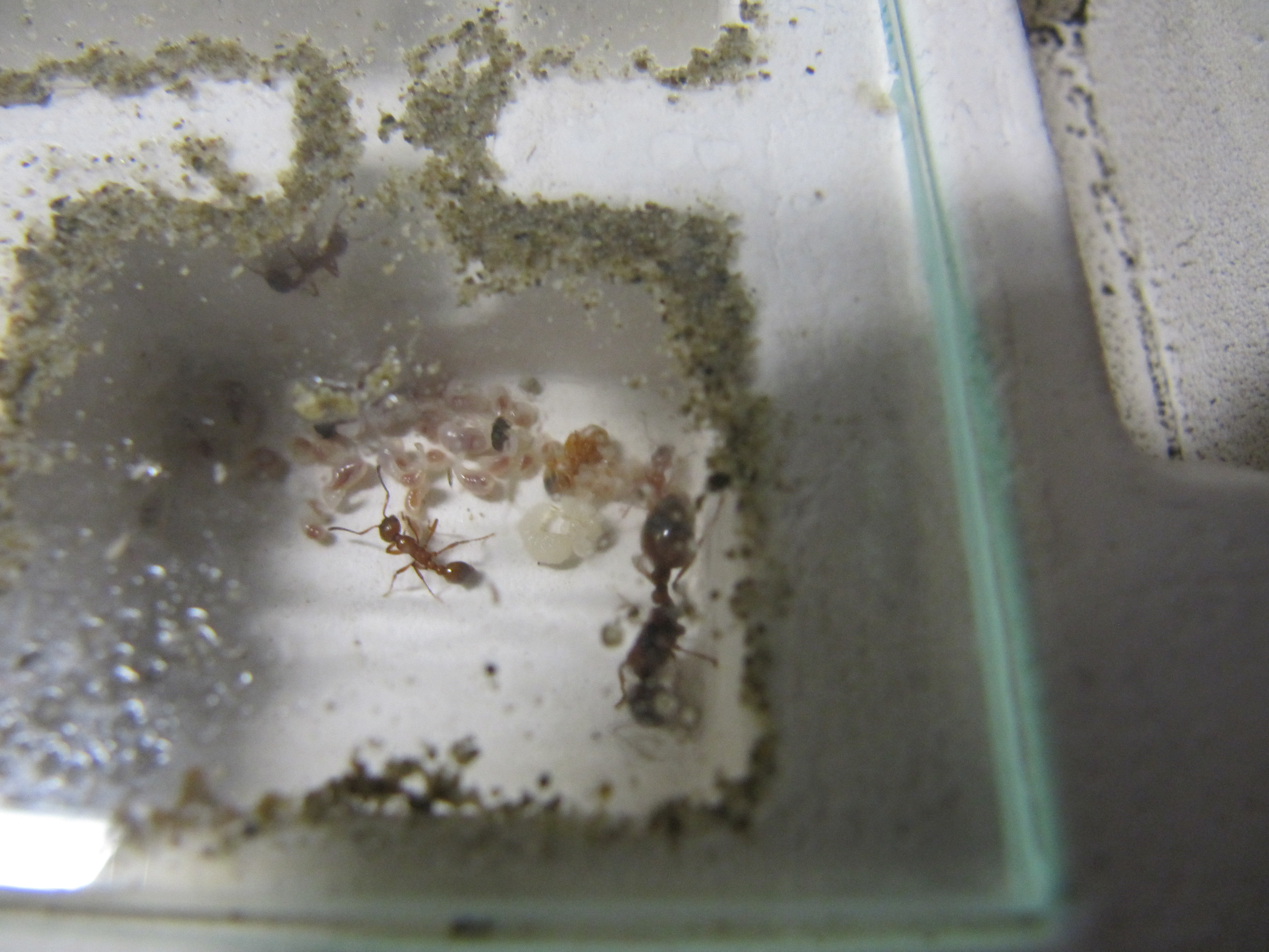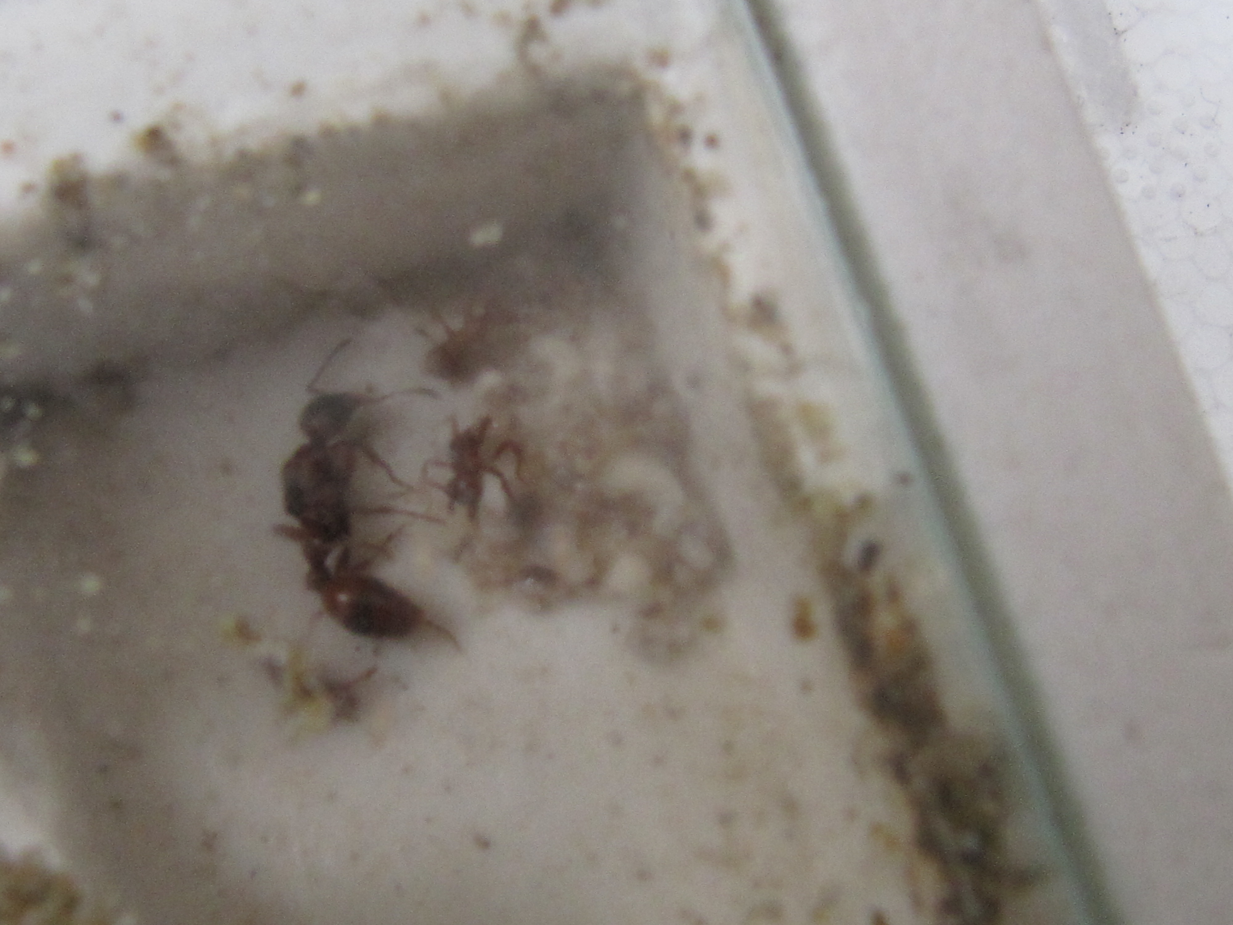 Ich habe daraufhin das Reagenzglas entfernt, und von da an jeden zweiten Tag ein totes Heimchen (2mm) oder eine Drosophila in die Arena gelegt. Die Dame hat es mir damit gedankt, dass sie begann, mit den Flügeln und anderen nicht verwerteten Überresten von Futtertieren, den kleinen Spalt zwischen Glas und Gips am Rande ihrer Kammer auszufüllen. Das hat mich wegen der drohenden Schimmelgefahr natürlich überhaupt nicht gefreut. Ich hab dann rasch etwas lebende Springschwänze in die Arena gegeben, die mithelfen sollten, den drohenden Schimmel zu verhindern. Allerdings habe ich ihnen dann doch nicht zugetraut, dass sie innert nützlicher Frist mit der Menge an Material zu Rande kommen. Deshalb beschloss ich kurzerhand, der