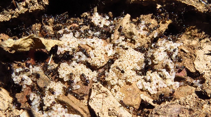 So werden die Nester ausgebaut, bis einige hundert Arbeiterinnen vorhanden sind, allerdings steigt der Erdanteil im Laufe der Zeit deutlich, da die Ameisen vermehrt anfangen zu graben und mit dem Aushub das Nest zu erweitern.
