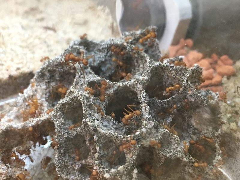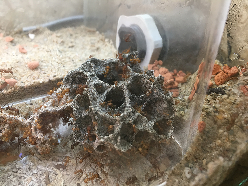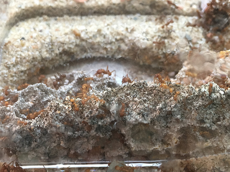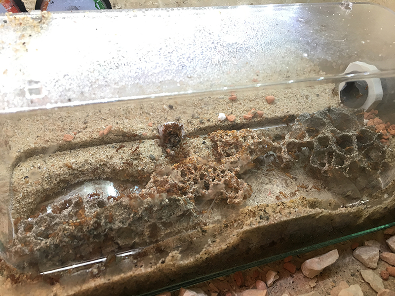 Am eigentlich gedachten Aus/Eingang stehen ganz viele Ameisen und bauen das ganze irgend wie auch zu. Sie haben 3 neue EingÀnge durch den Sand gebaut.