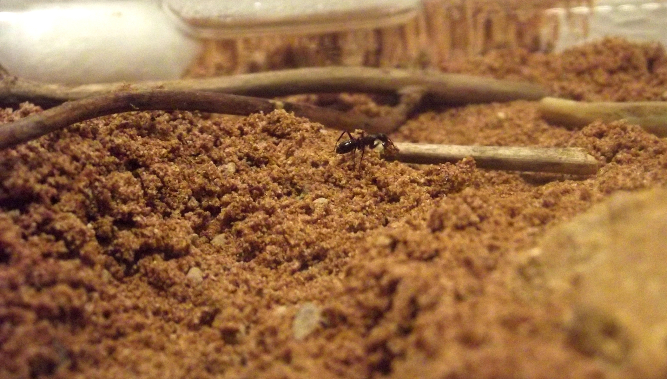 Das Formicarium. Noch etwas leer, wird es sich aber hoffentlich im Laufe des Jahres füllen. Mit steigender Anzahl an Ameisen werde ich mehrere Klettermöglichkeiten anbieten. Der Aktuelle Favorit, der Steinhaufen oben links im Eck. Eine Arbeiterin befindet sich knapp vor dem Nesteingang.