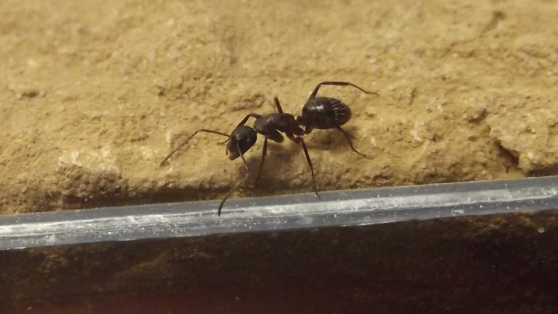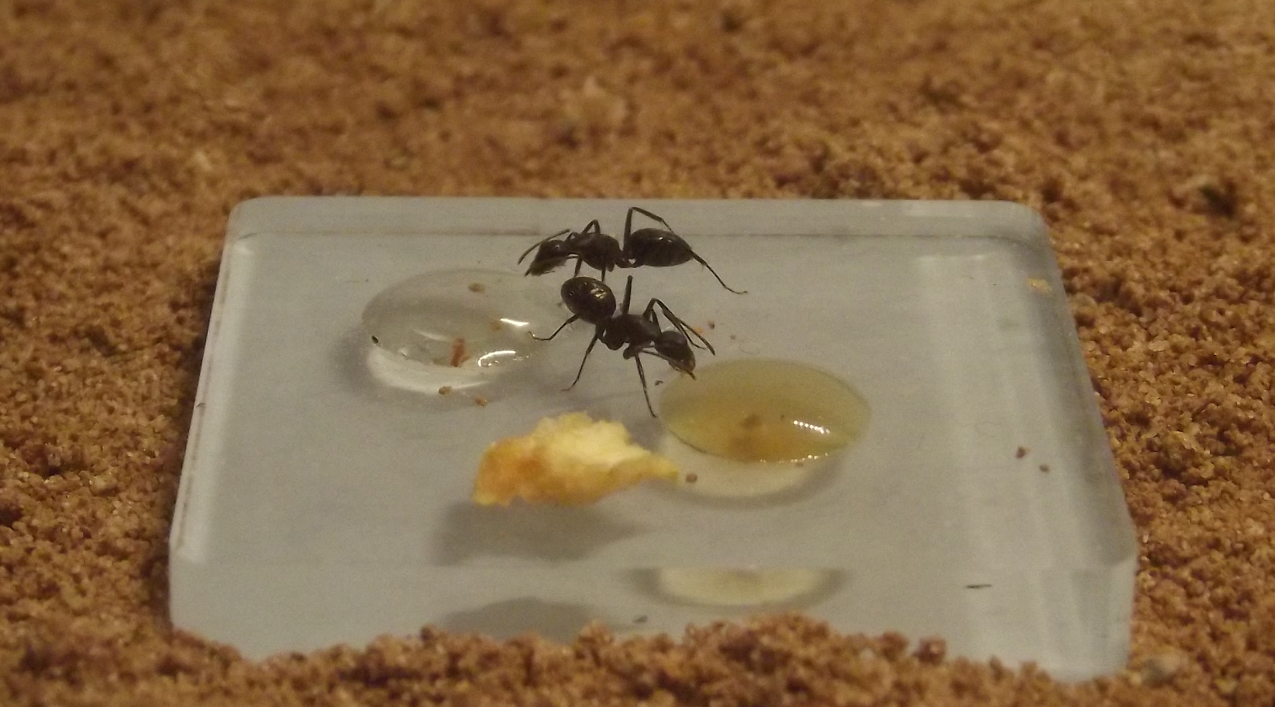 Beide Arbeiterinnen verlassen gerne mal das Nest um ihre neue Welt zu erkunden, die Honigquellen haben sie bereits gefunden und auch sonst, scheint das Formicarium schon größtenteils erkundet zu sein. Was mich bei zwei Arbeiterinnen wirklich wundert, da ich davon ausging, dass diese fast immer im Nest bei Brut und Gyne verharren würden.