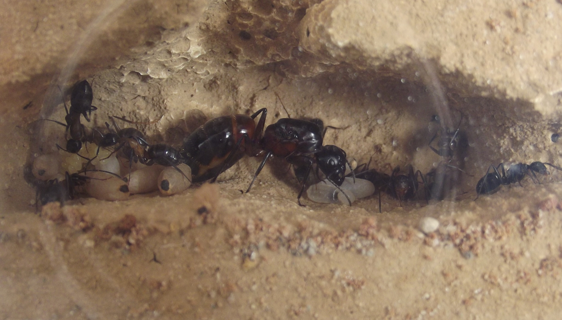 Heute sind wieder 2 Arbeiterinnen geschlüpft, somit sind es insgesamt nun 8 Stück. Man sieht immer mal wieder eine Arbeiterin herumlaufen, die meiste Zeit verweilen sie aber alle gemeinsam in ihrem Nest. Die Königin war auch fleißig, das Eierpaket scheint gewachsen zu sein. Gestern habe ich das Nest mit 10 ml Wasser befeuchtet. In der Nacht ist über dem Nest an der Scheibe des Aquariums etwas Wasser kondensiert, heute Morgen konnte ich beobachten, wie zwei Arbeiterinnen von diesen Tropfen getrunken haben. Proteine scheinen sie momentan nicht anzunehmen, was ich aber darauf zurückführe, dass die drei vorhanden Larven schon kurz vor dem Verpuppen sind und daher schlichtweg momentan keine Proteine benötigt werden.