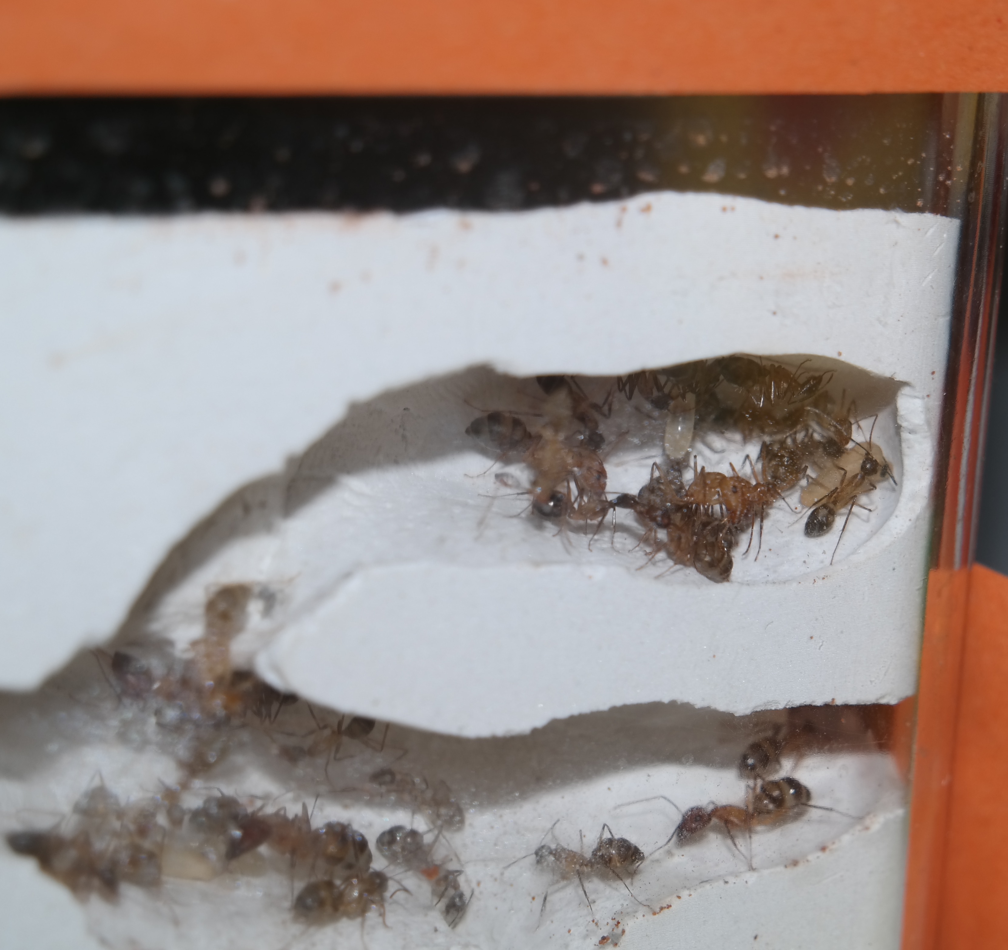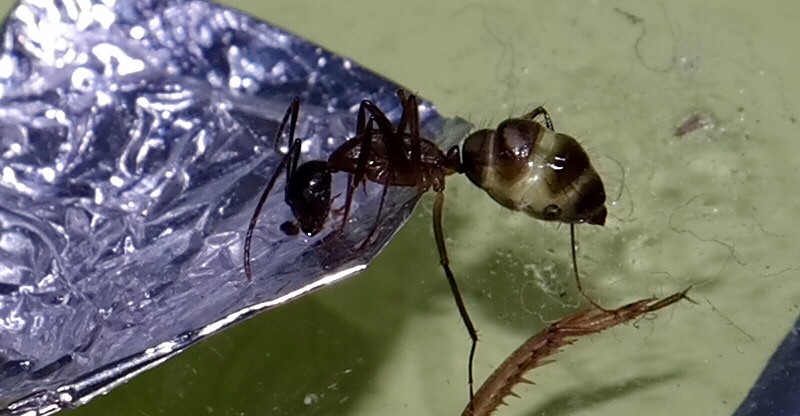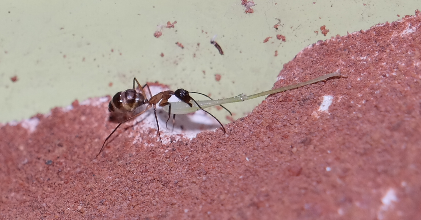 Momentan haben Sie eine recht hohe Außenaktivität. Jeden Abend, wenn es im Raum dunkler wird, sind immer 2-3 Arbeiterinnen unterwegs. Durch befeuchten der Arena, lassen sich aber auch tagsüber leicht ein bis zwei Arbeiter heraus locken. Den Eingang des Reagenzglases haben sie zu großen Teilen mit den Steinchen zu gebaut. Auch das Alufolienstückchen, auf dem Honigwasser angeboten wurden, wurde mit verbaut.