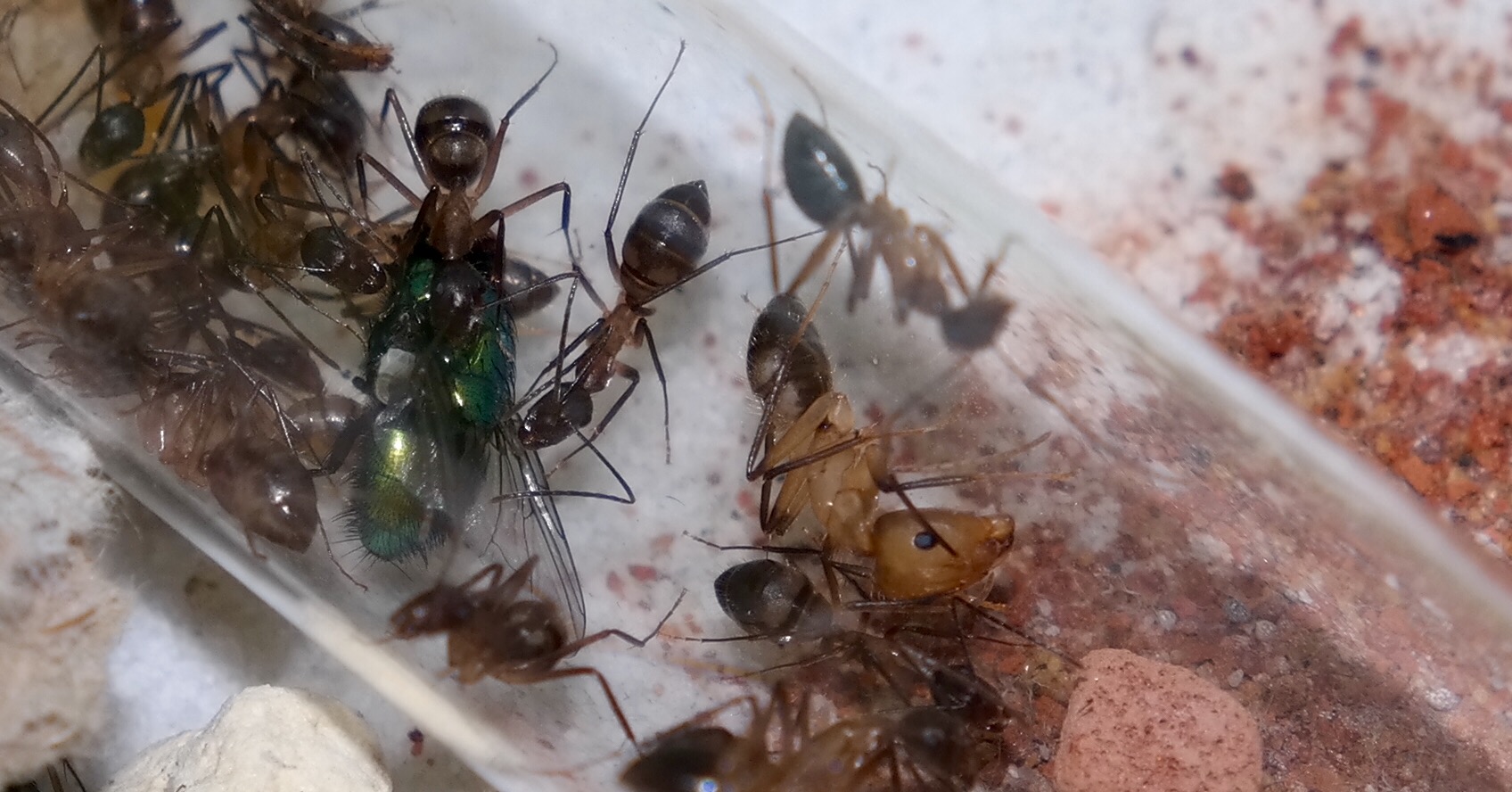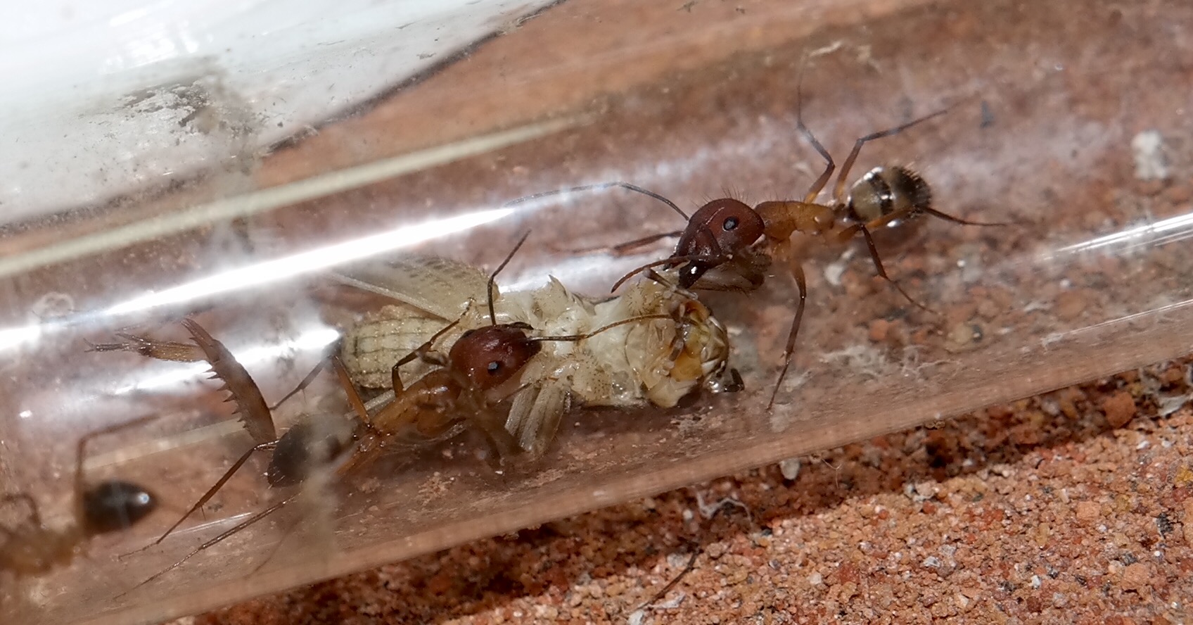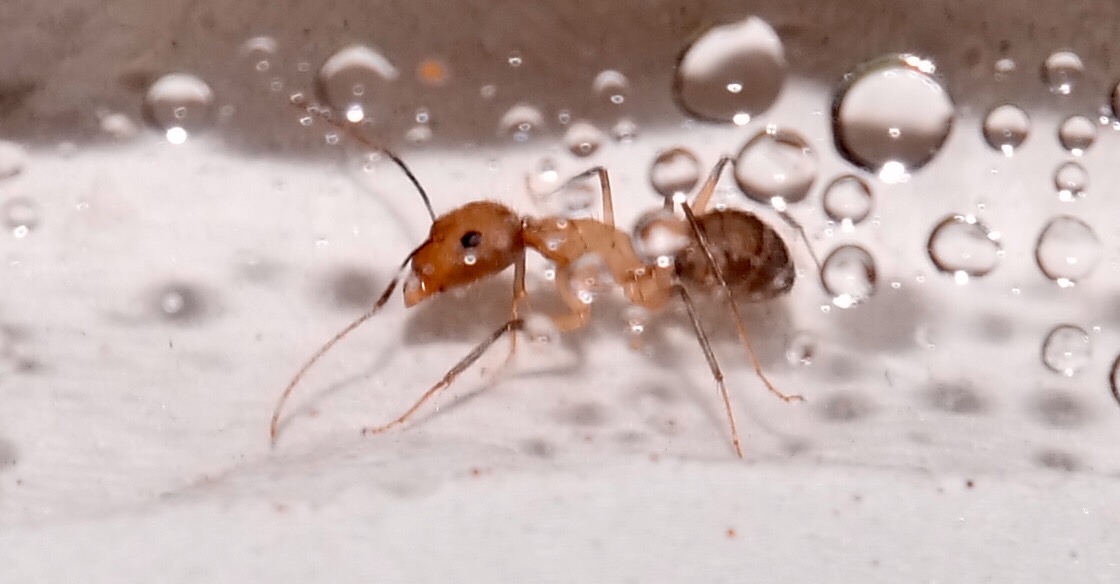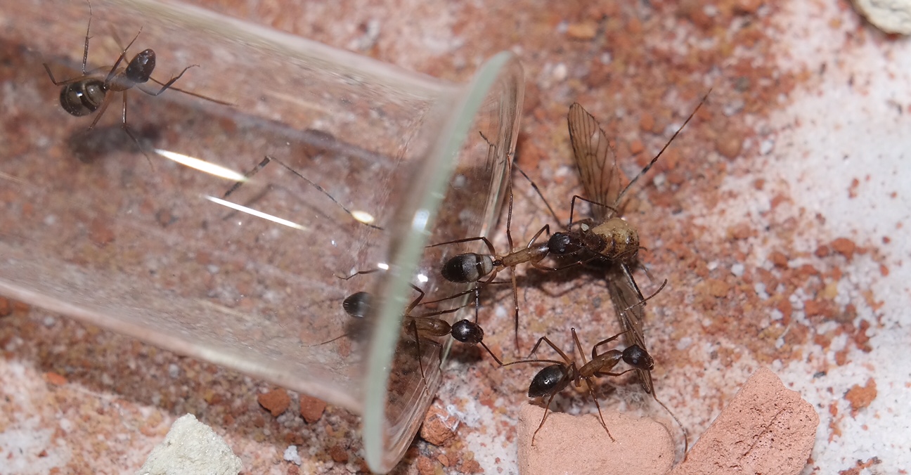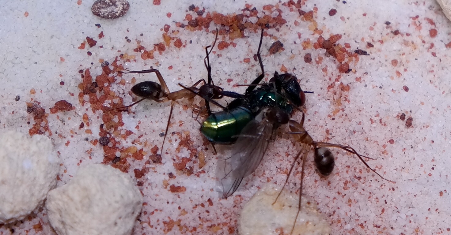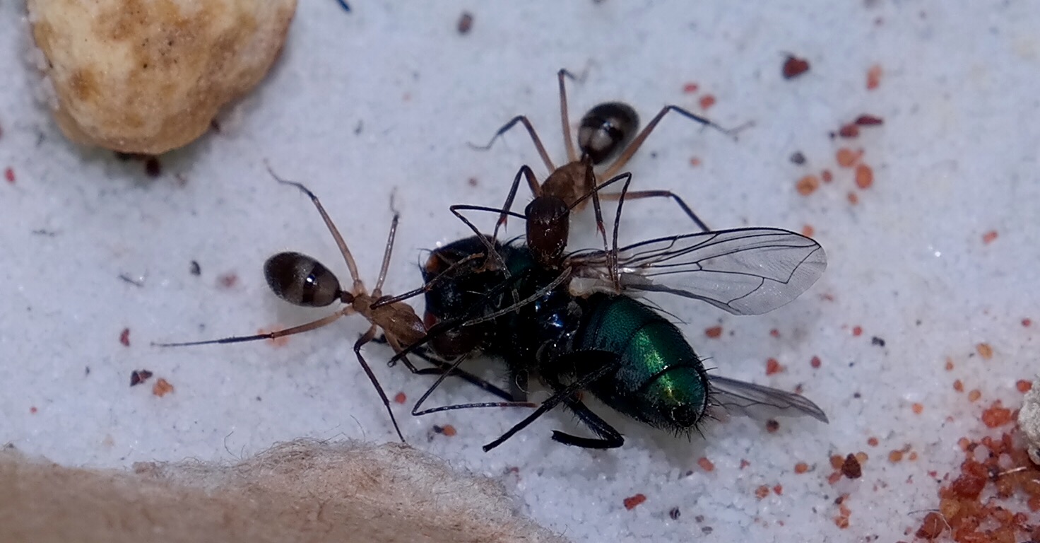 Nachdem ich das geöffnete Reagenzglas in die Arena gelegt habe, sind sofort vier Arbeiterinnen auf Erkundungstour gegangen, und haben sich mit Honigwasser vollgepumpt. Einige frisch tote Fruchtfliegen, die ich angeboten habe, wurden ignoriert.