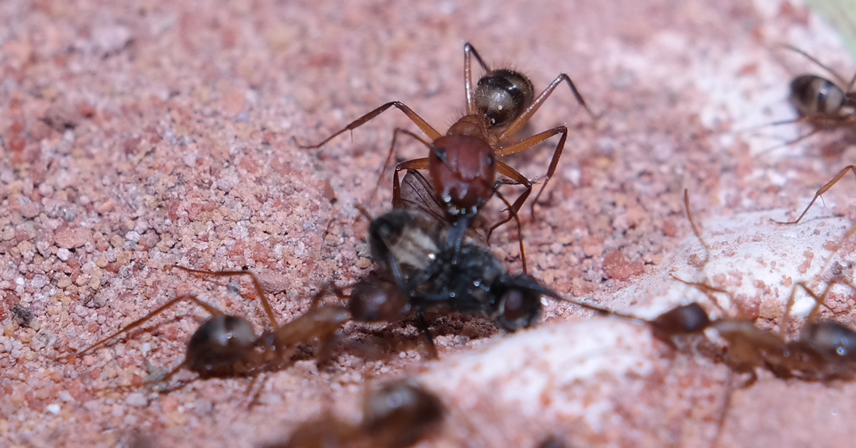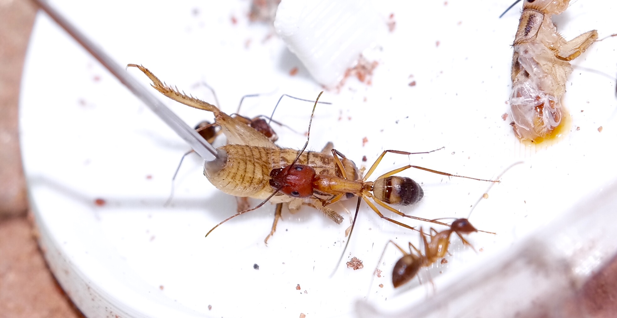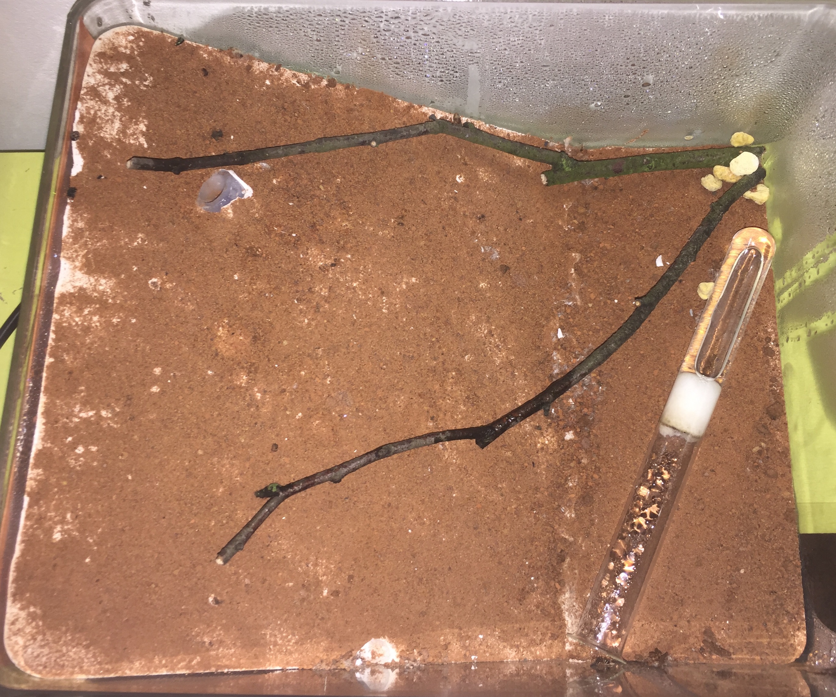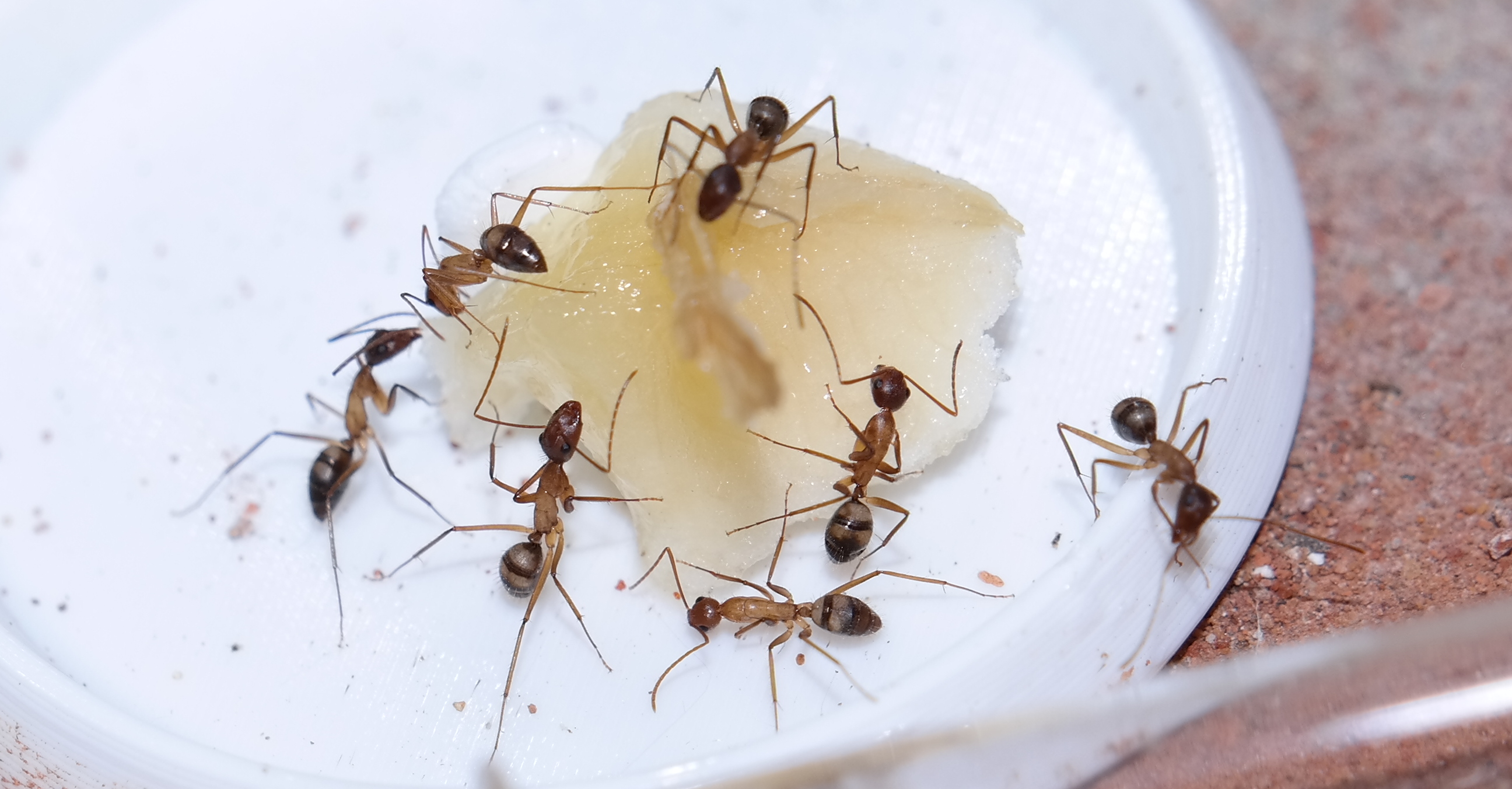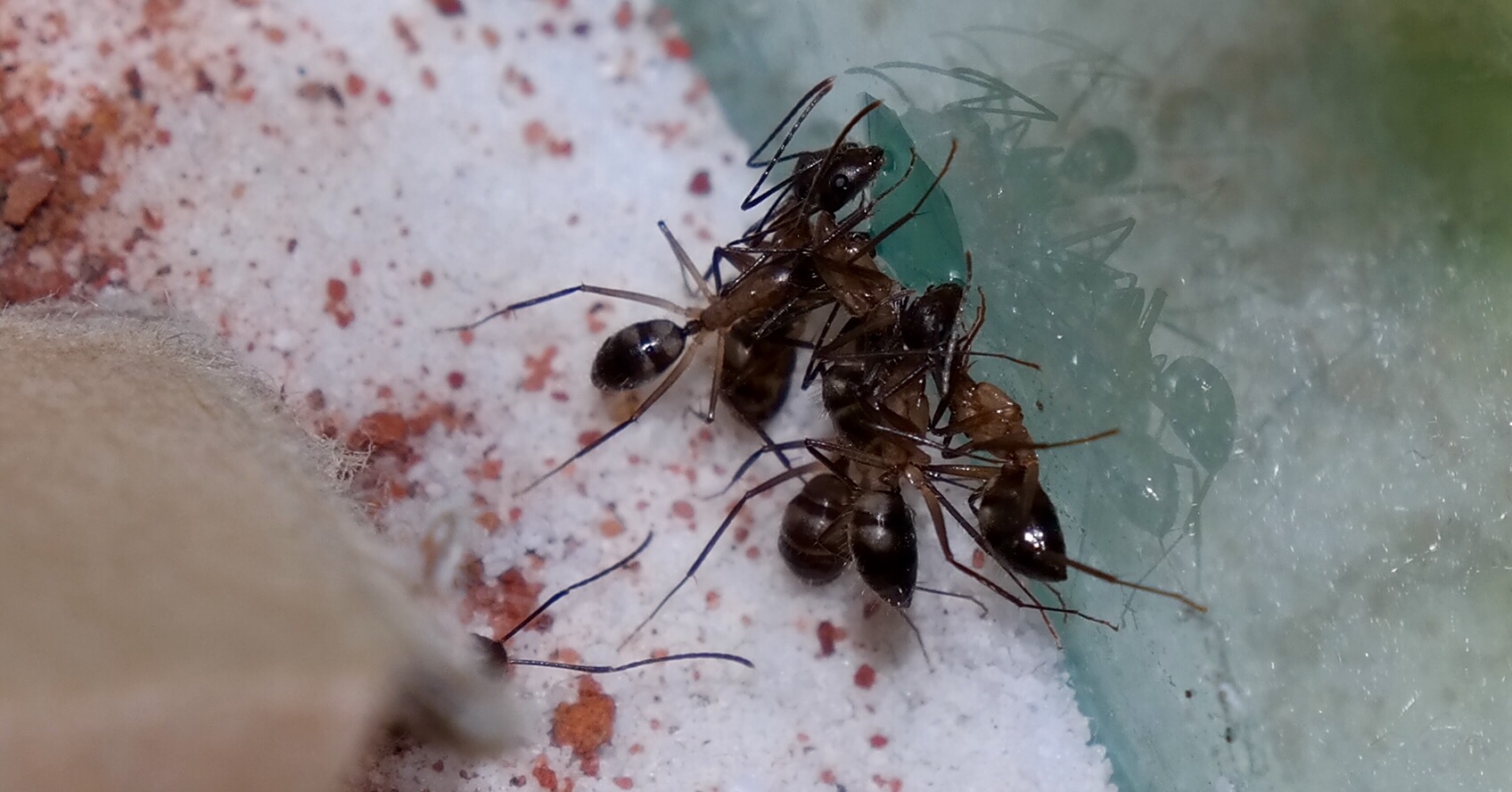 Nachdem ich das geöffnete Reagenzglas in die Arena gelegt habe, sind sofort vier Arbeiterinnen auf Erkundungstour gegangen, und haben sich mit Honigwasser vollgepumpt. Einige frisch tote Fruchtfliegen, die ich angeboten habe, wurden ignoriert.