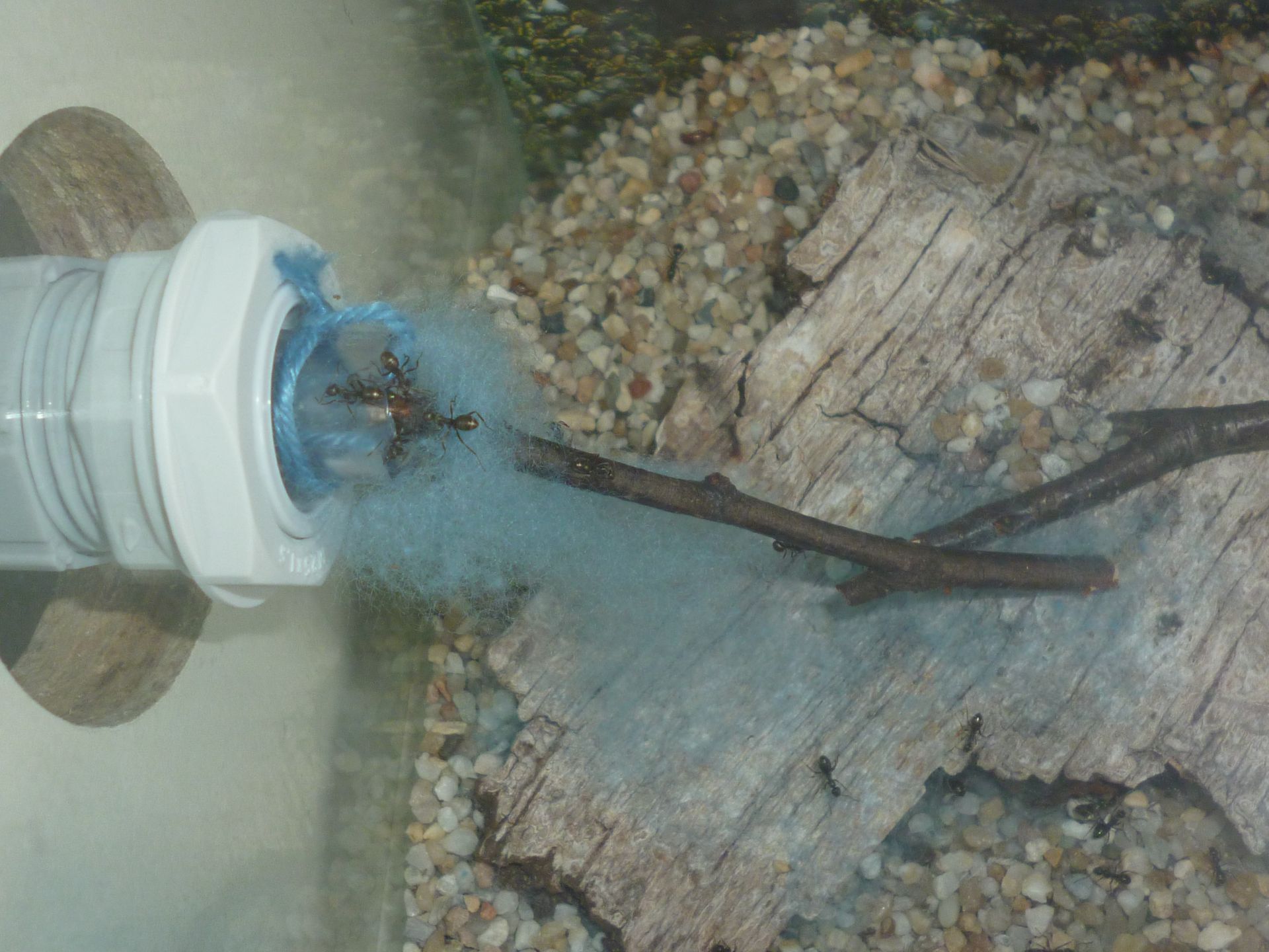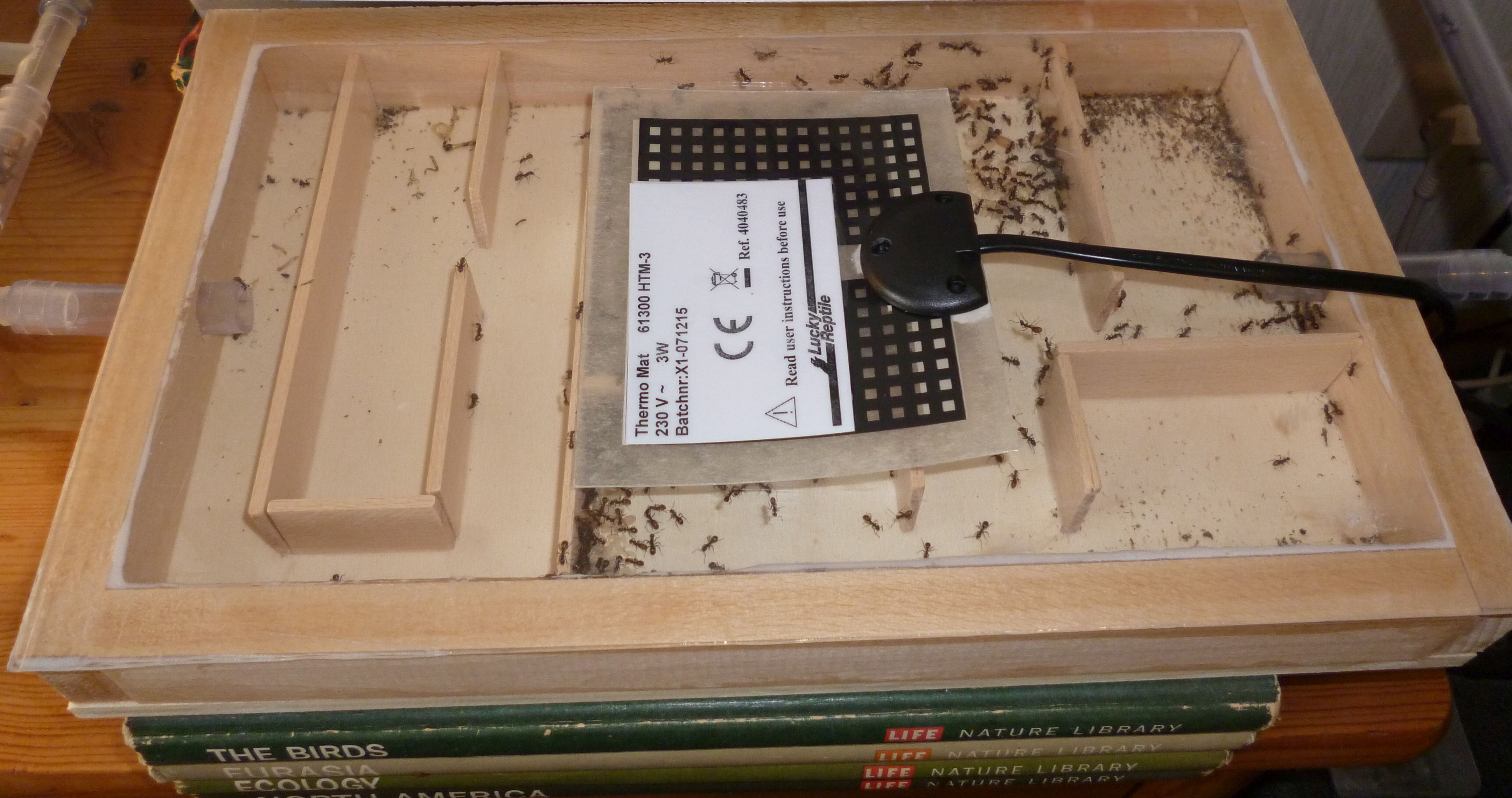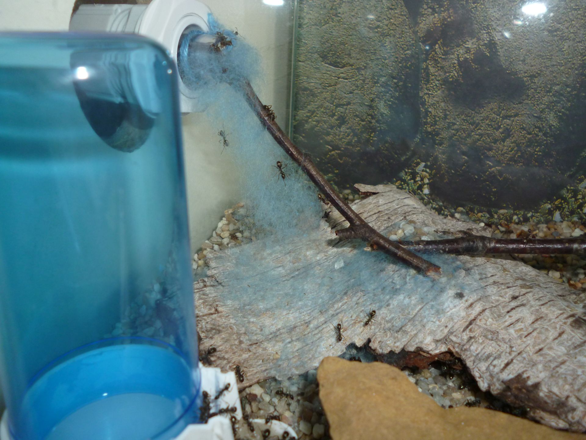 So wird nun eine runde Sache aus der ganzen Konzeption. Die Kolonie hat nun ein leicht feuchtes Ytongnest und ein beheiztes, trockenes Holznest zur Verfügung. In der Arena haben sie auch noch ihre selbstgebauten Nestanlagen unter der Rinde und im trocken gelegten Wasserspender. Ach ja, nicht zu vergessen die Schlauchverbindungen, diese sind stets gut besetzt mit Arbeiterinnen und
