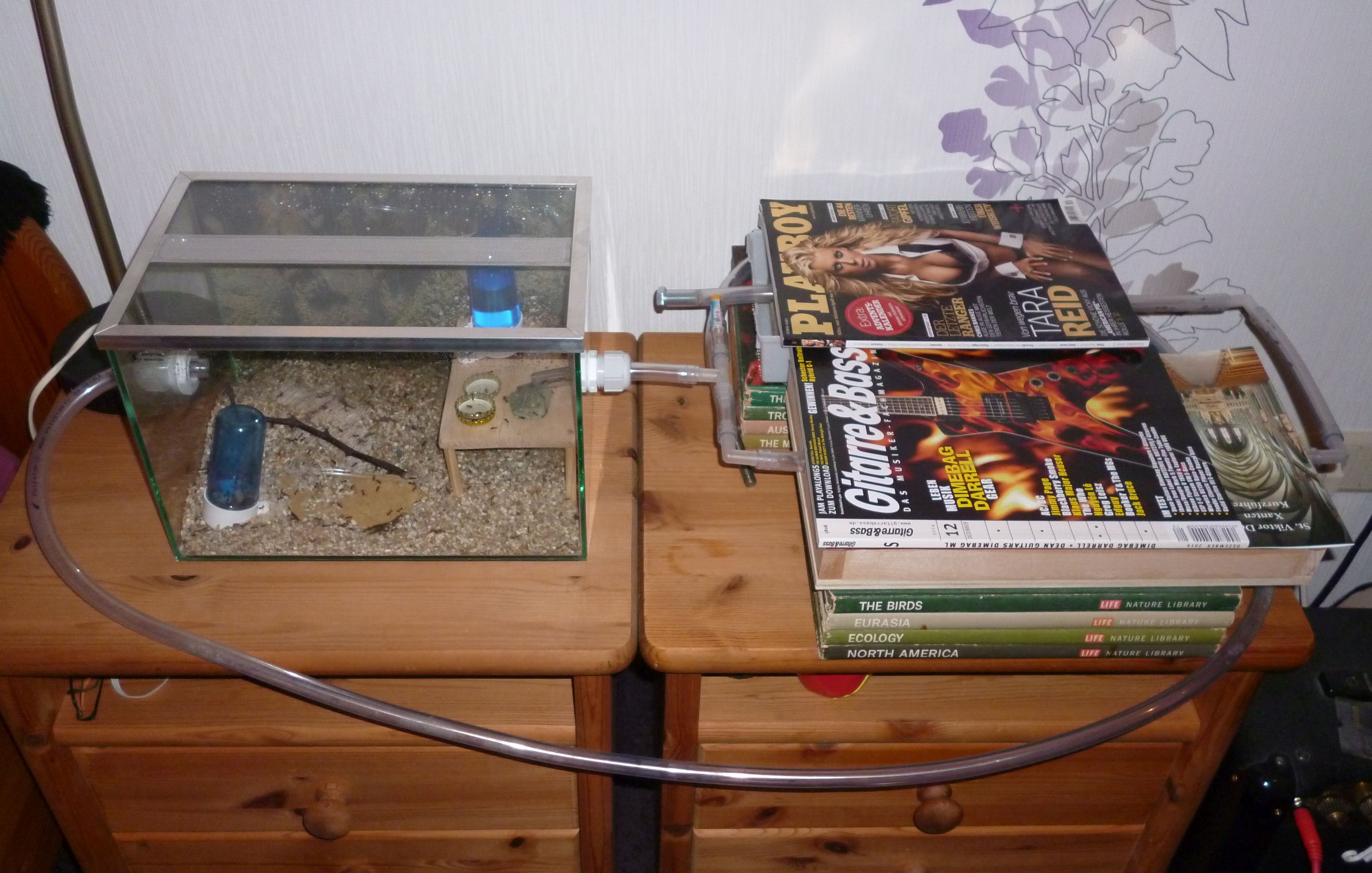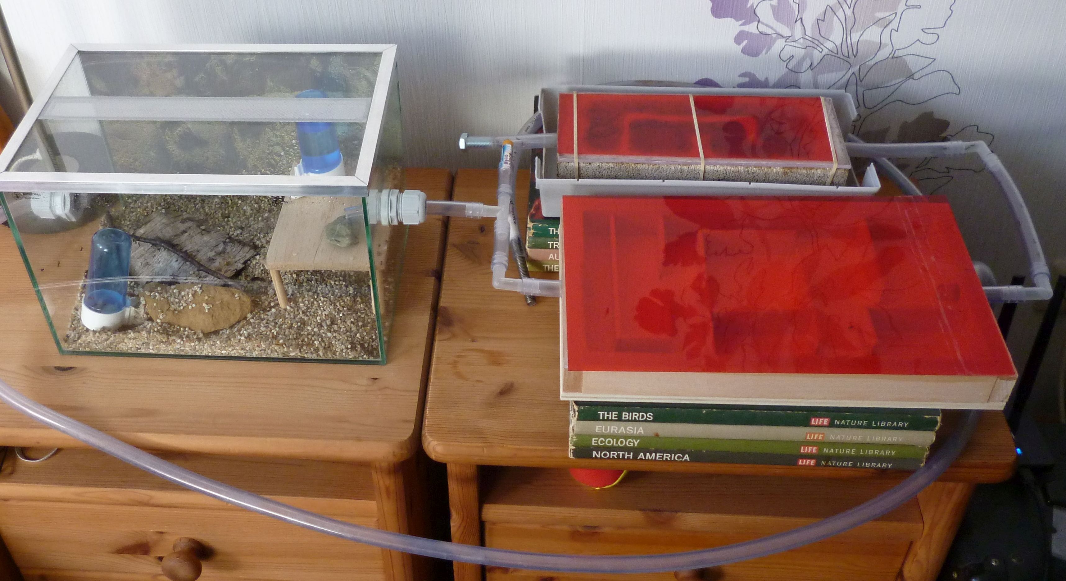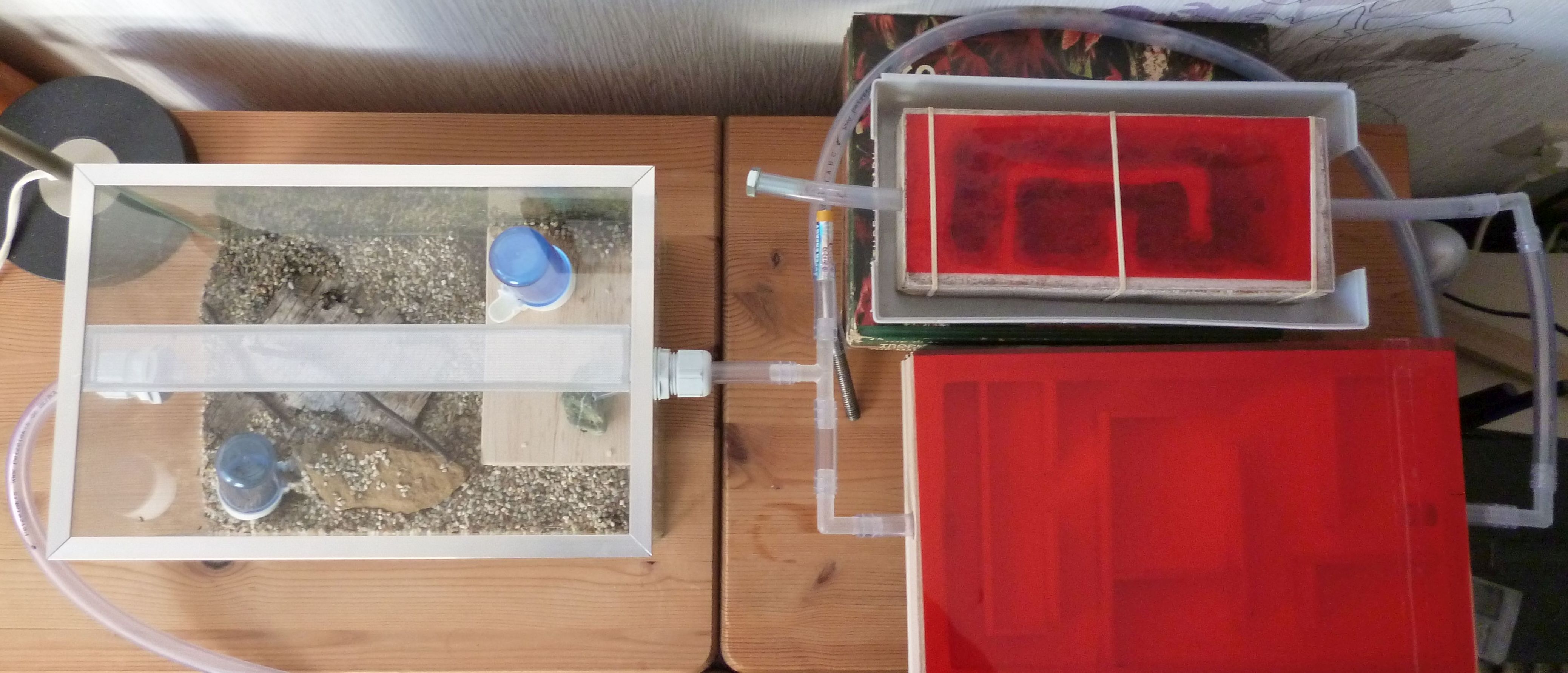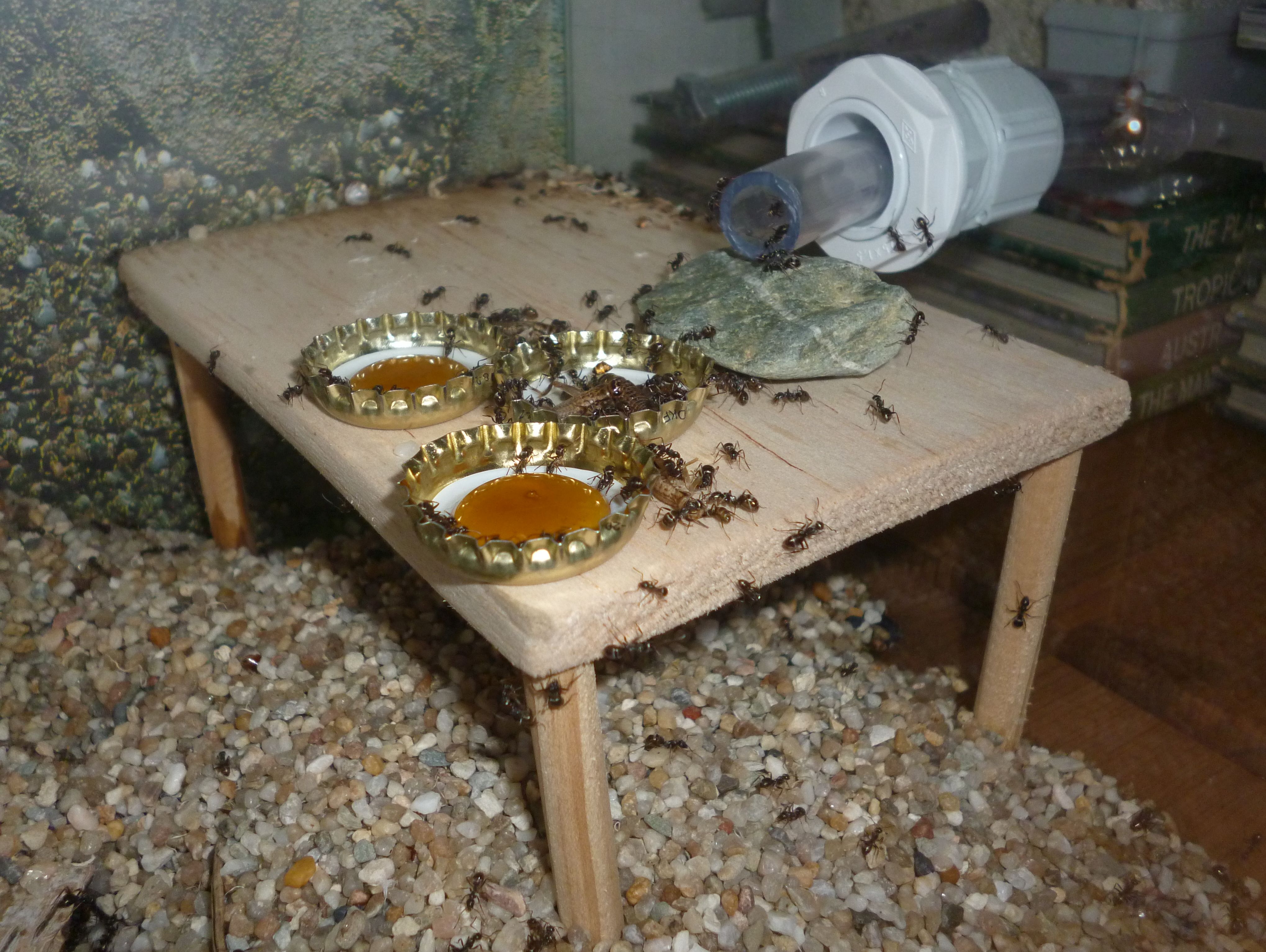 So wird nun eine runde Sache aus der ganzen Konzeption. Die Kolonie hat nun ein leicht feuchtes Ytongnest und ein beheiztes, trockenes Holznest zur Verfügung. In der Arena haben sie auch noch ihre selbstgebauten Nestanlagen unter der Rinde und im trocken gelegten Wasserspender. Ach ja, nicht zu vergessen die Schlauchverbindungen, diese sind stets gut besetzt mit Arbeiterinnen und