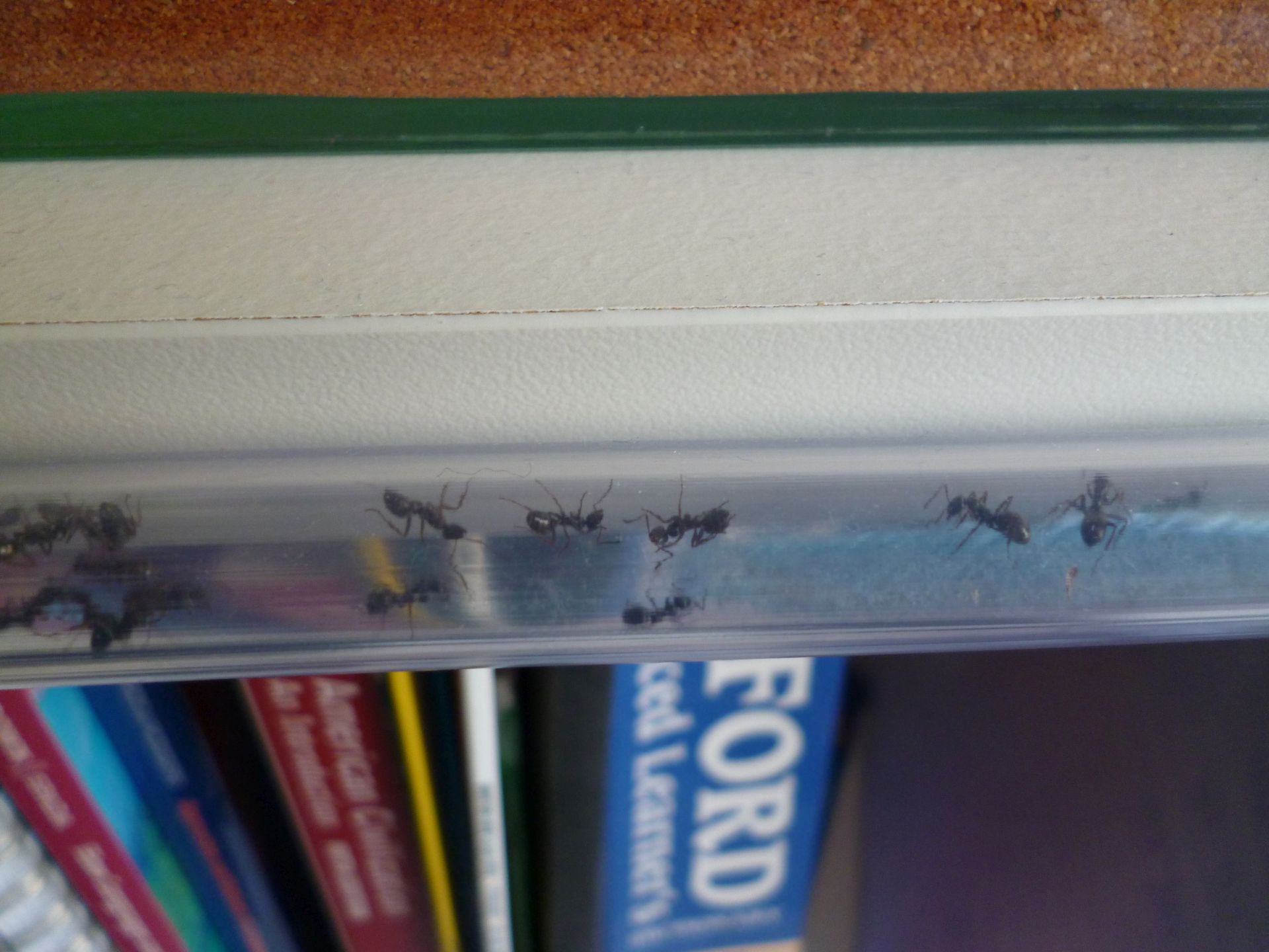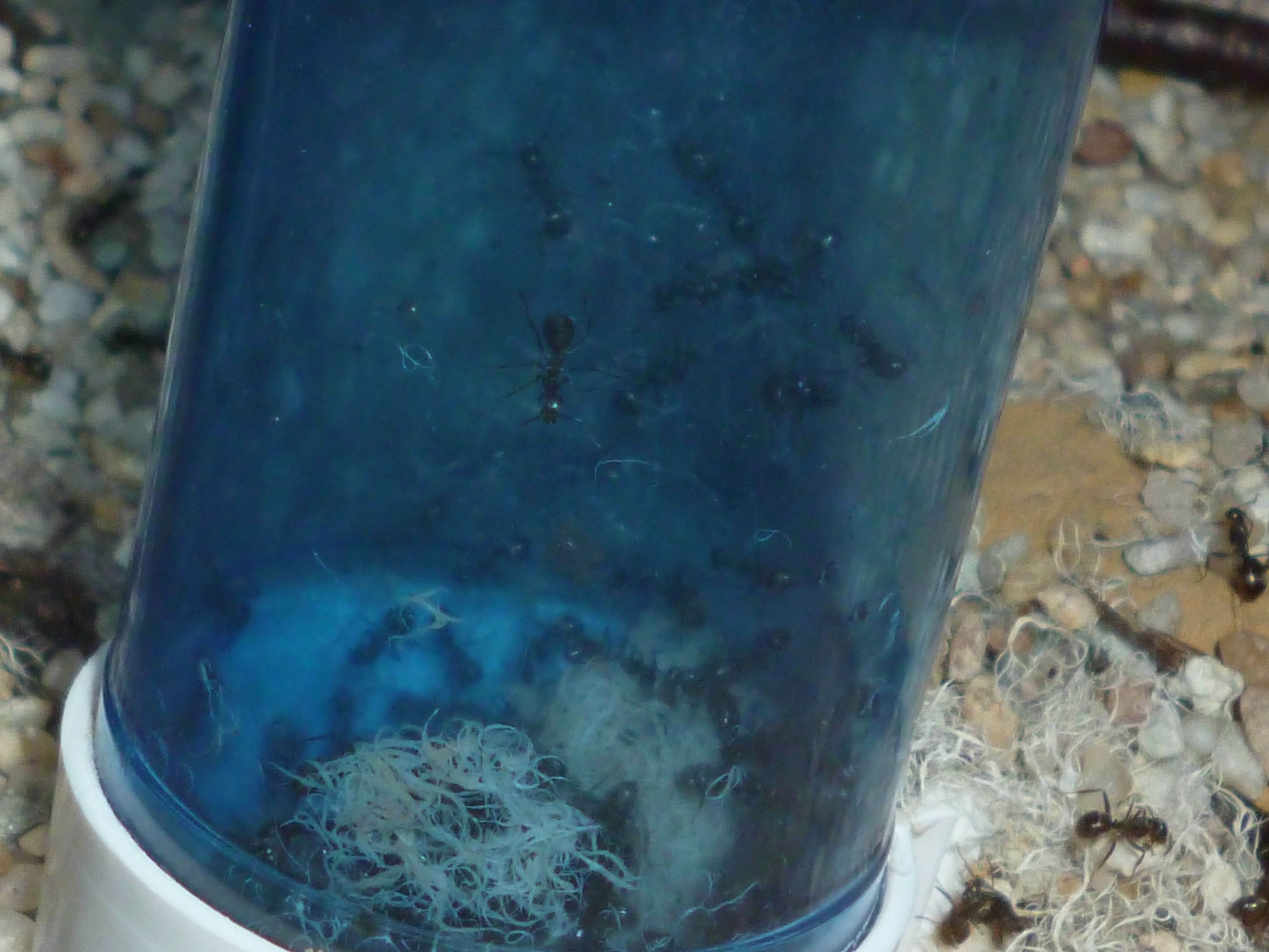Die zweite Anpassung betrifft den Ausbruchschutz. Die Bestrebungen auszubrechen sind seit dem Ende letzter Saison immer mehr zum Problem für mich geworden. Der Paraffinölstreifen am Beckenrand hält die Ameisen nicht zuverlässig auf, insbesondere an den Ecken des Beckens schaffen die Arbeiterinnen es den Deckel zu erreichen. Das ist sehr nervig bei der Fütterung, da immer erst der Deckel kontrolliert werden muss, ob sich Arbeiterinnen an seiner Unterseite festkrallen. Auch kann man das Becken nicht mal kurz geöffnet lassen, sei es zur Belüftung, oder weil man schlicht vergisst den Deckel wieder aufzulegen.